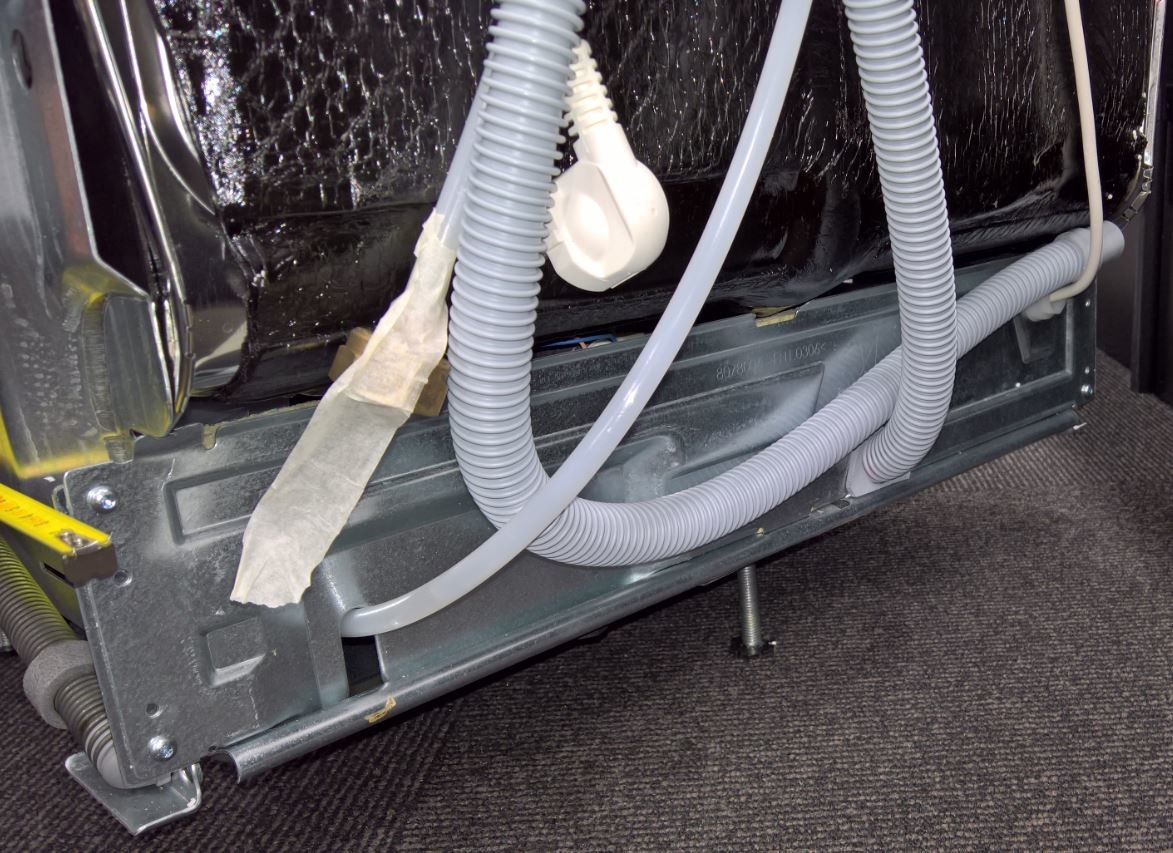 När det byggdes i mitten på 70-talet så har de dragit ett 100mm avloppsrör på golvet bakom diskmaskinen. Detta gör att det 60cm djupa utrymmet blir tajt. Den ursprungliga diskmaskinen hade ett urtag längst ner, som gjorde att det passade, så även den andra som gick sönder i fjol. Då hade jag en överbliven Electrolux maskin som jag fraktade dit, men den rackaren kommer inte in då slangar för vatten & avlopp går in i nederkant. Så denna har nu fått stå där ca en decimeter ut. Men detta vill vi inte ha, utan behöver finna en diskmaskin som passar. Avloppsröret går tyvärr inte att flytta på så lätt.