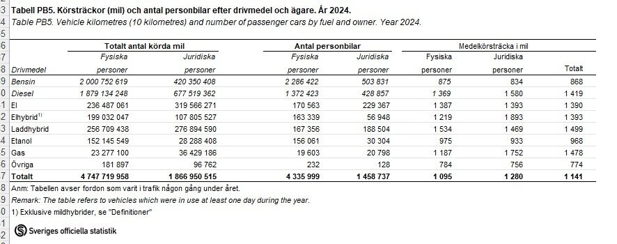 Nja - 1504 mil gäller både företags- och privatleasade bilar. Så 1280 mil är sanningen för företagsägda bilar.🙂P PHPersson skrev:Statistiken saknar tillräckligt med data för att säga vara sig det ens eller andra.