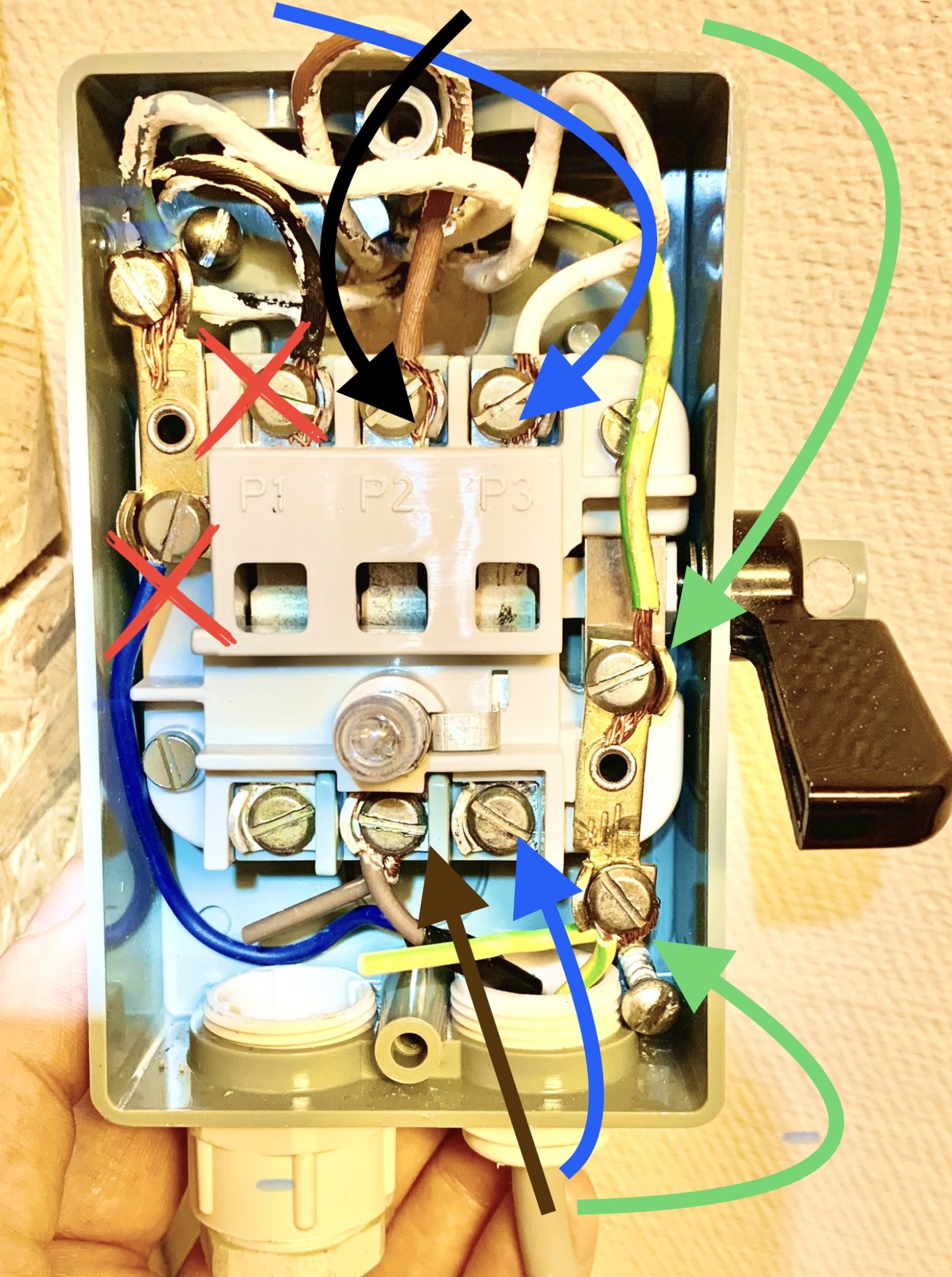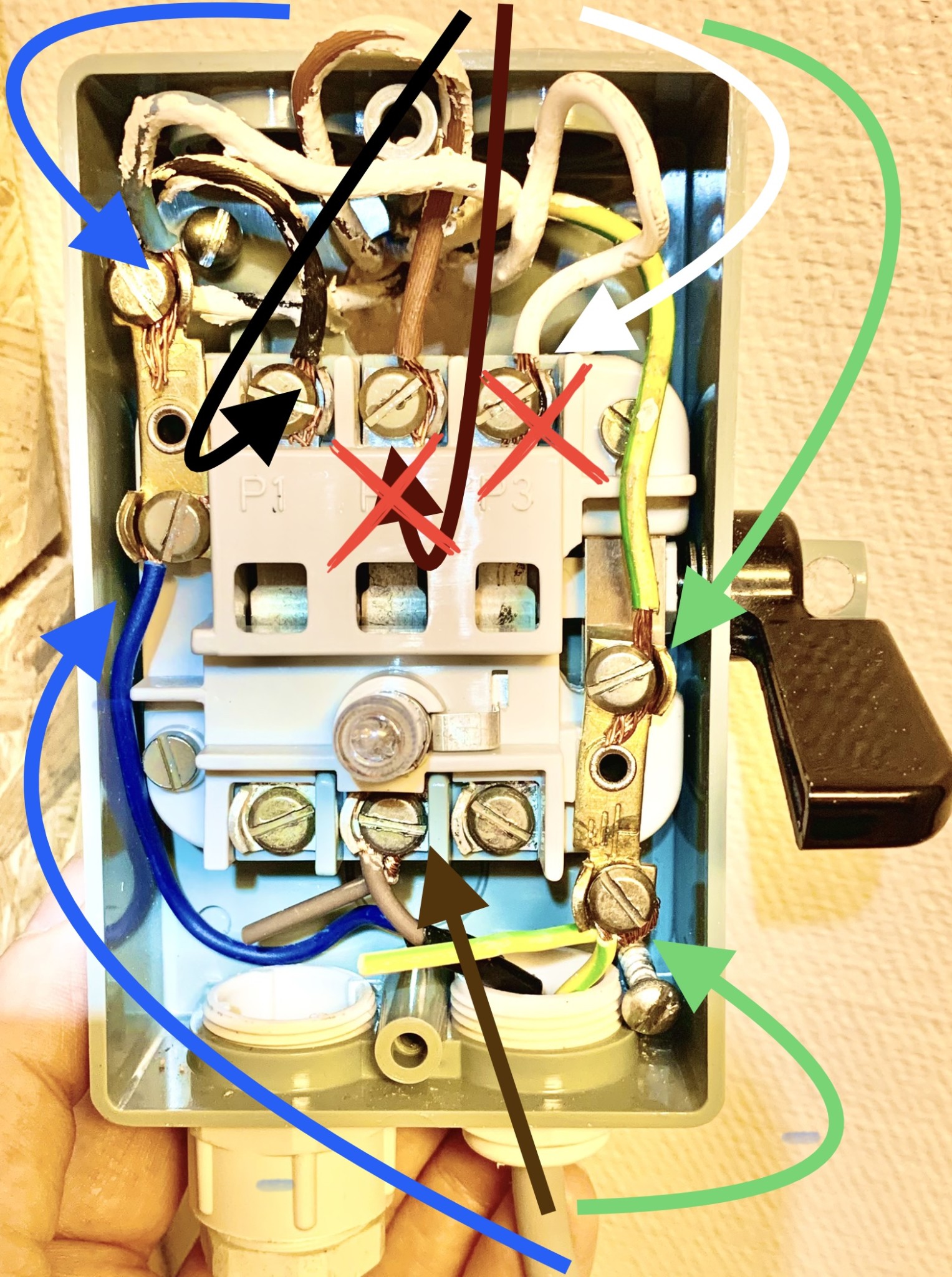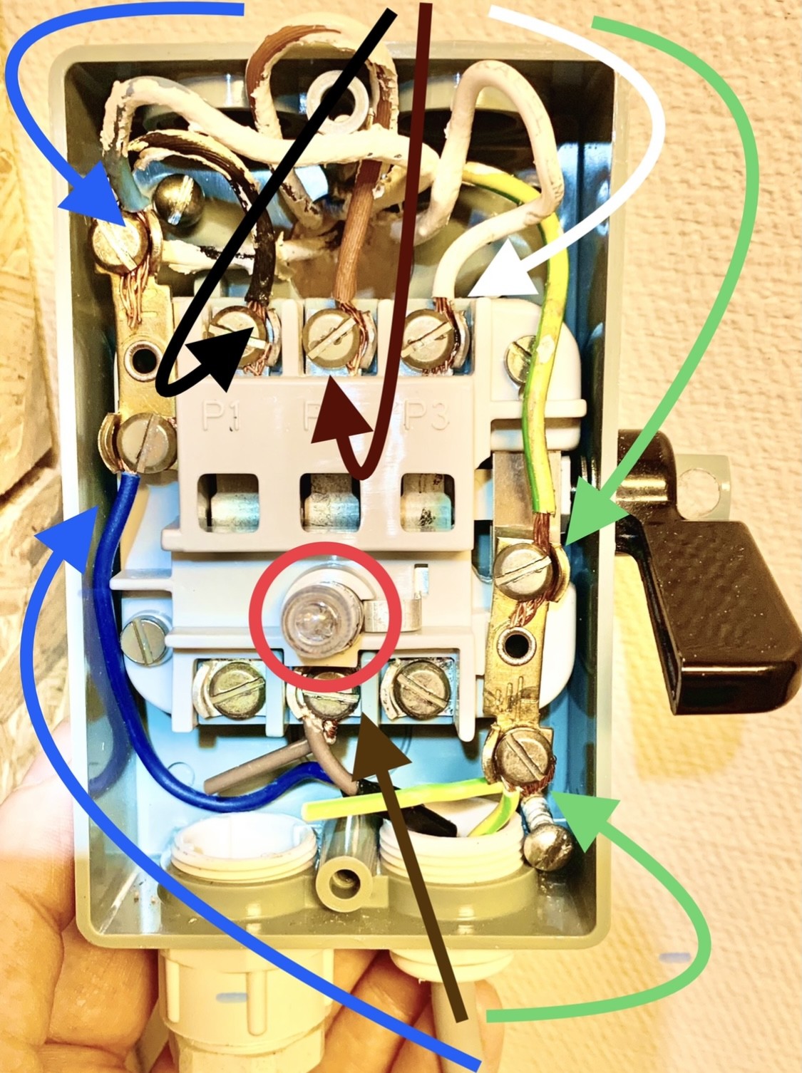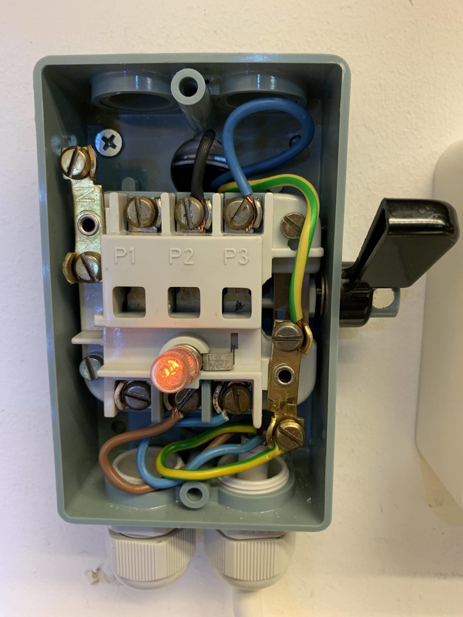 Någon som vet varför lampan (markerad med röd cirkel) på strömställaren/strömbrytaren slutar lysa om man kopplar utan/kopplar bort andra och tredje fasen (brun och vit ledare — överkryssade, huset är byggt 1983)?