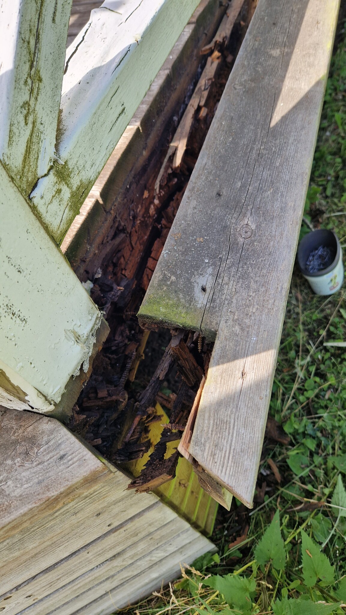 Att de impregnerade staketstolparna totalt ruttnat skyller jag frun som absolut skulle måla dem plus att konstruktion med kryss var snygg men en dålig idé, då vattnet blir stående.