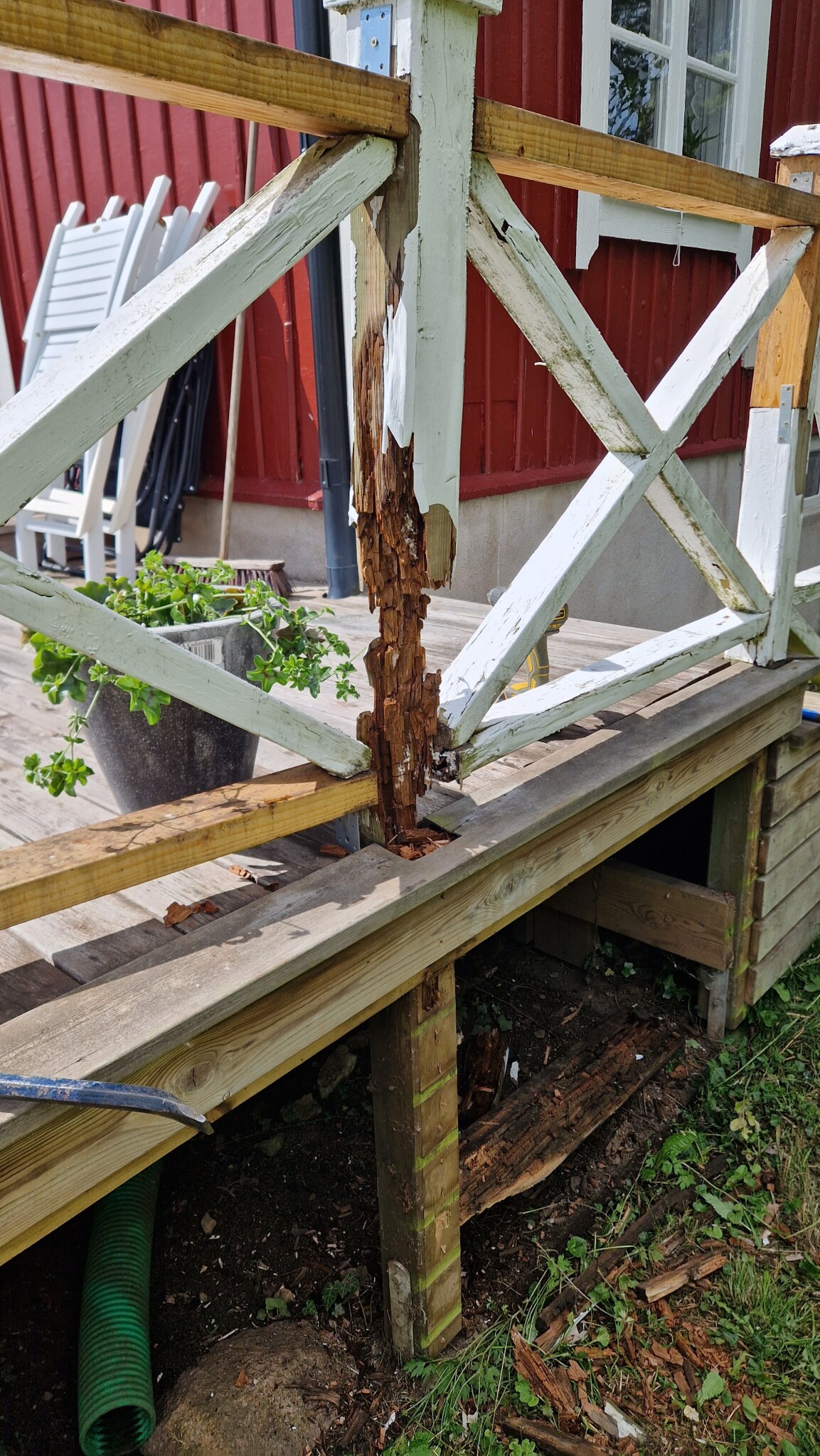 Nej men på reglarna på den andra bilden. Stolparna ruttna nog pga färg och kryssen som leder vattnet till stolpen. Sen hade snickarna gjort urtag i stolparna vilket jag tror var dumt. Hade nog varit bättre med någor beslag.Rejäl skrev: