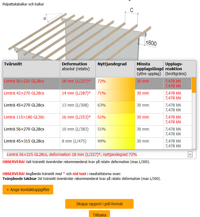 Där ser vi att nedböjning för tex 56x225 är 18 mm, och inte klarar kravet på L/200.