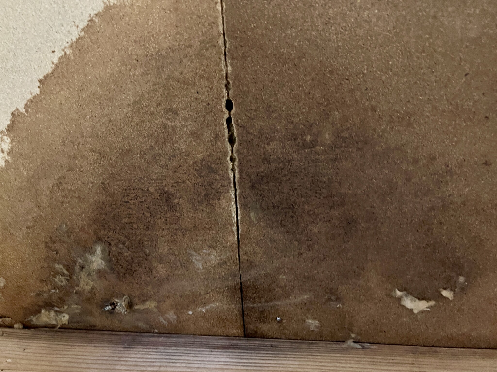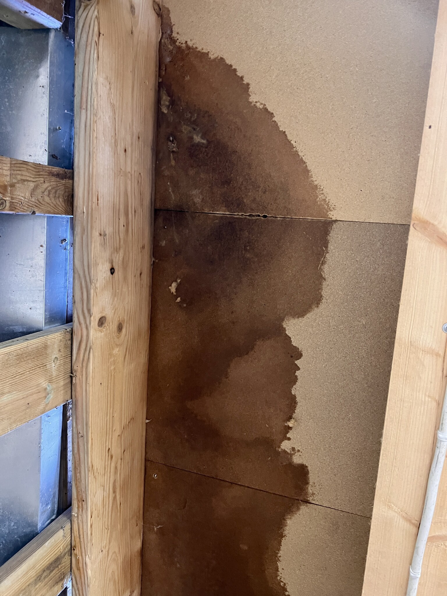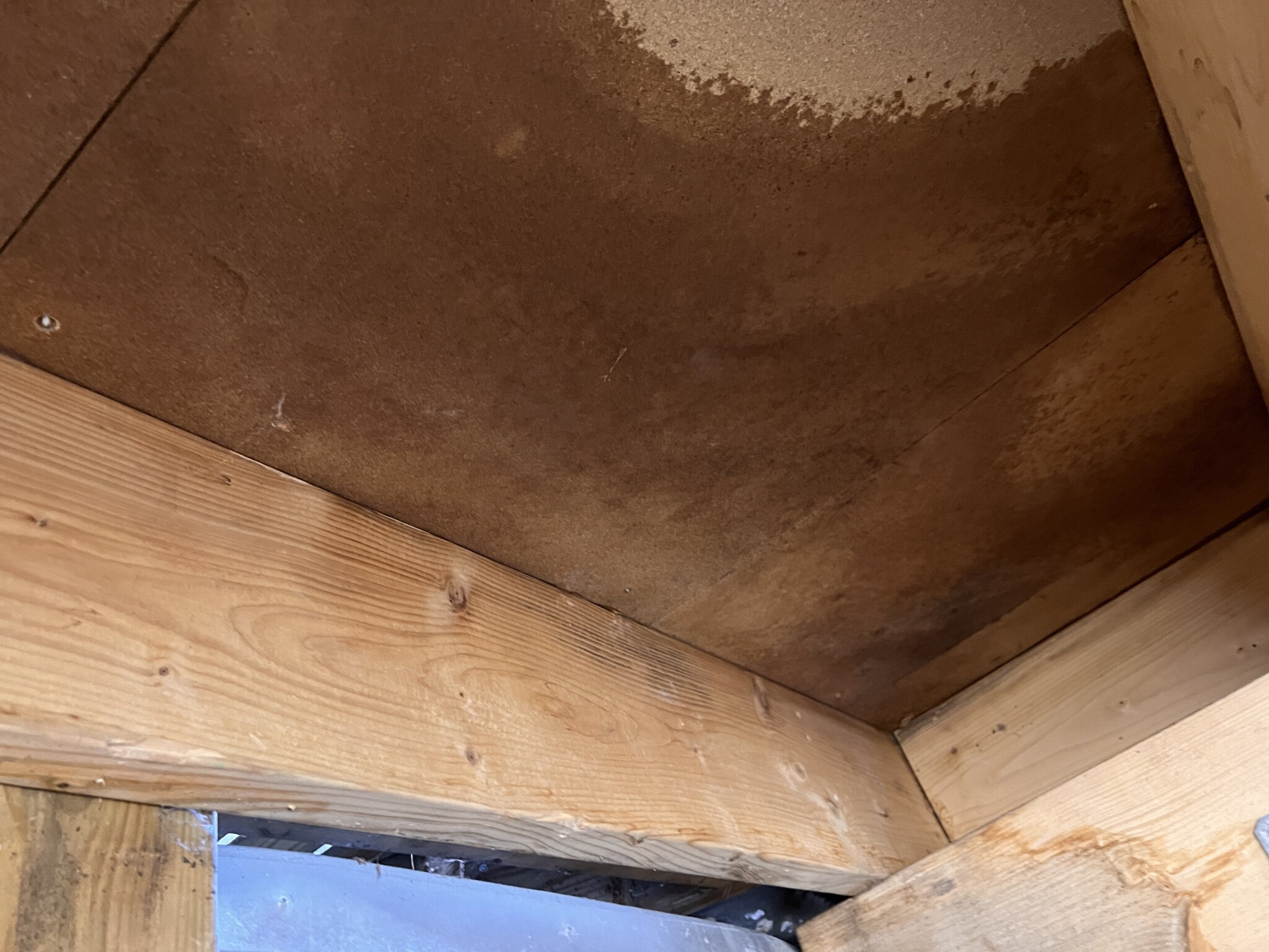 Upptäckte då att det läckt in lite vatten som fått klickgolvet att svälla. Öppnade upp golvet underifrån, plockade bort isoleringen och såg där en blöt fläck i masoniten. Har sedan haft det öppet underifrån på den platsen(ca 40cm x 40 cm) för försöka lokalisera läckan.