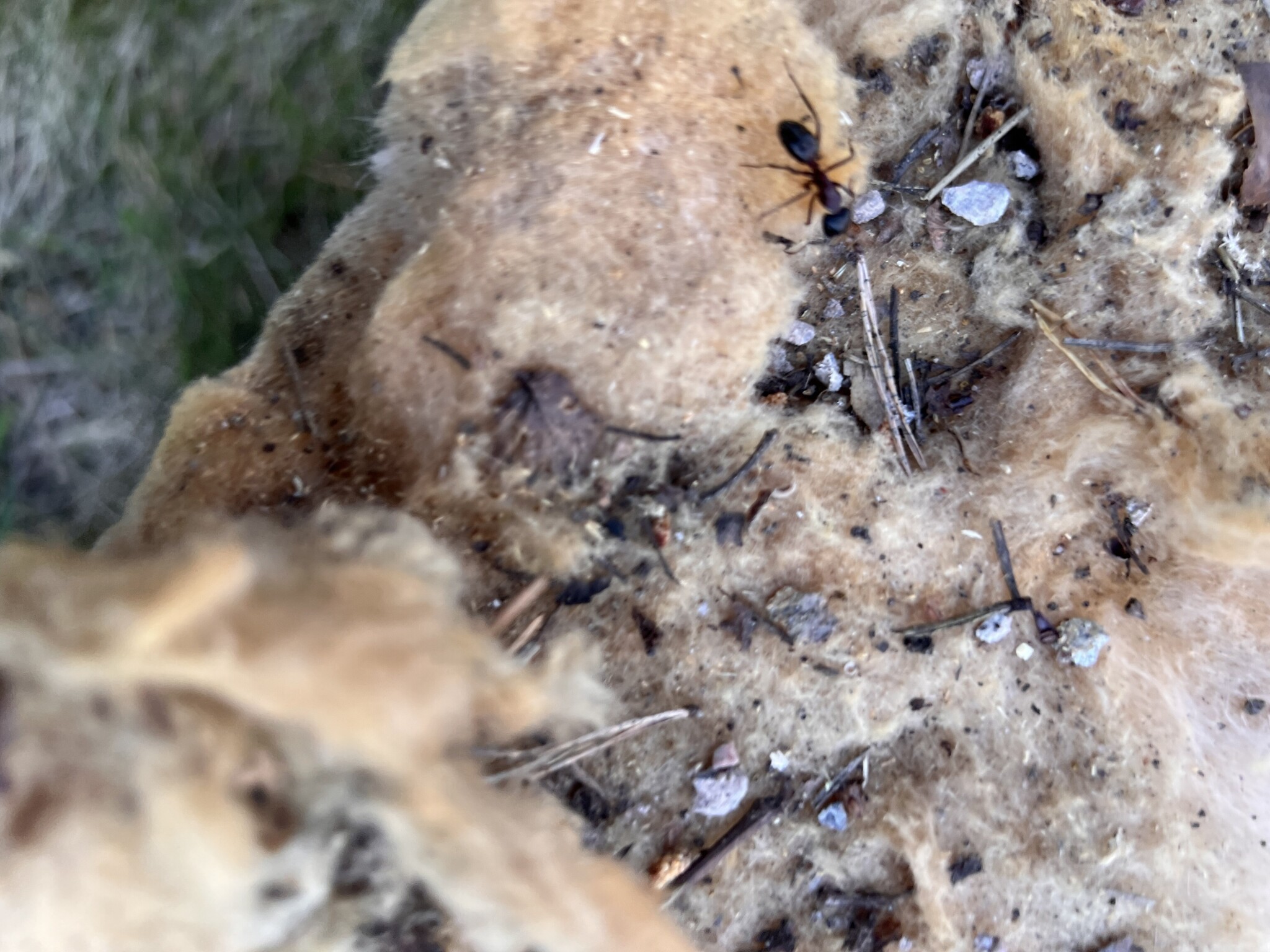 Plockade bort mer av isoleringen under golvet och såg då en massa spån i isoleringen. Och sen myra… och sen några till. Några små hål i en av masonitskarvarna. Och troligtvis ett helt myrbo i en av isobalarna. (Se bild)