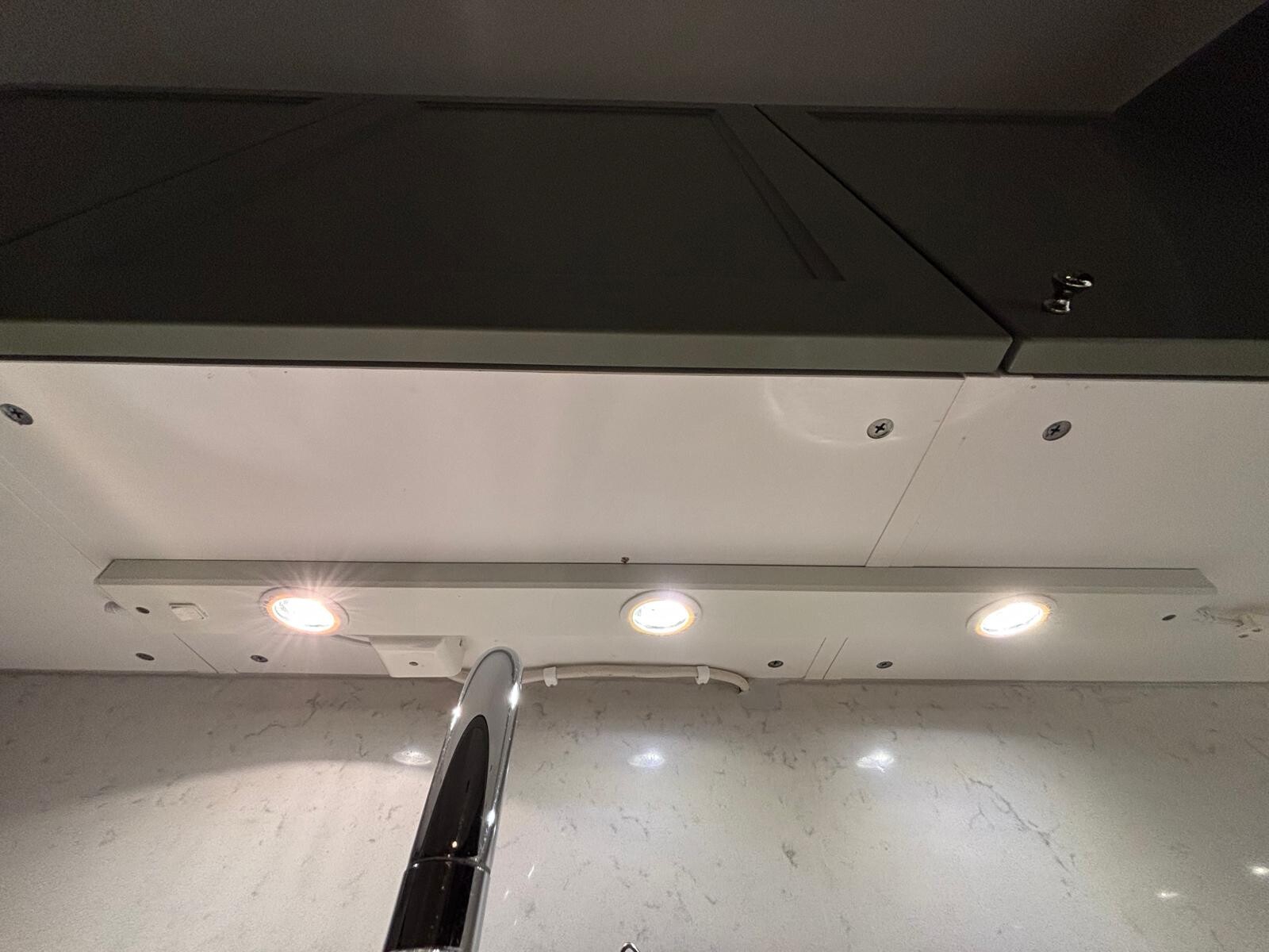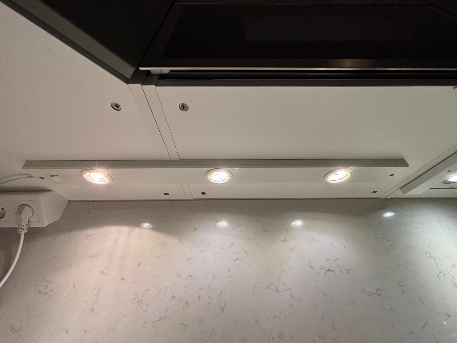 Ovanför diskbänken har jag en armatur med 3 lampor. Tidigare har jag använt 12V 20W halogen-lampor med G4-sockel, men verkar som att det är svårare att få tag på sådana nu - de lokala butikerna här rekommenderar LED-alternativ istället.