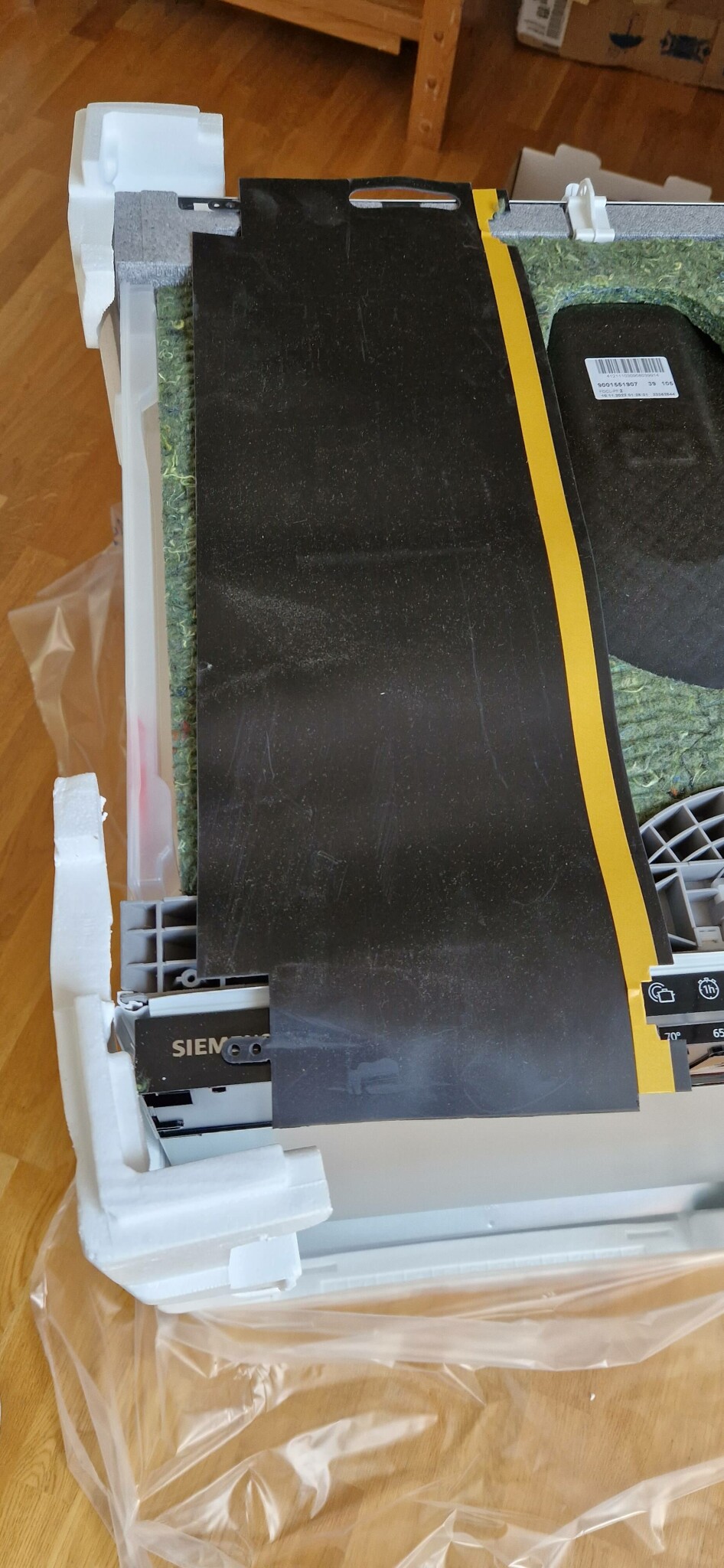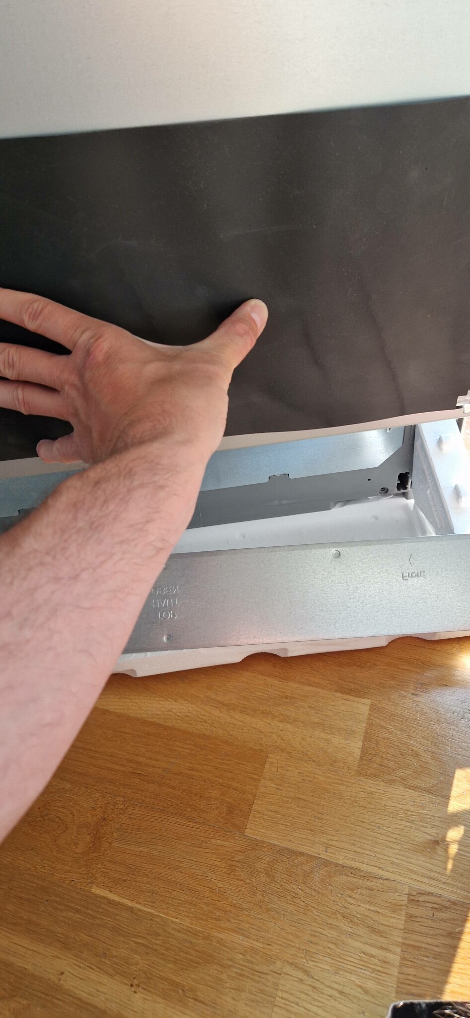 Nej den ska hänga framför bottenutrymmet, framför plåtluckan nederst på maskinen, där i själva "taket" mellan plåten och dörren. Så hängandes bakom din sockel. Men dom där ramlar ändå av efter en stund så du kan lika gärna strunta i denB Bambi2 skrev: