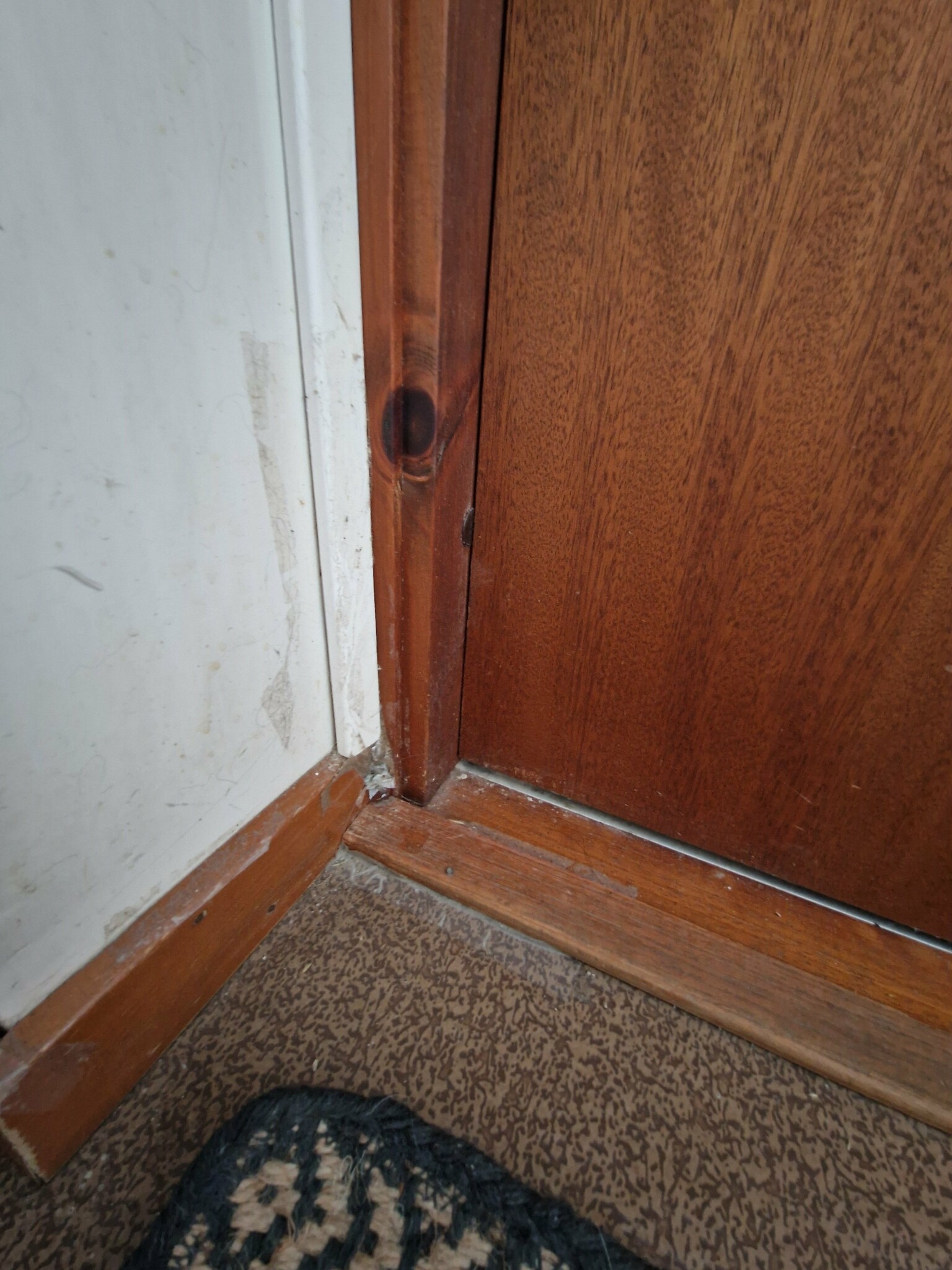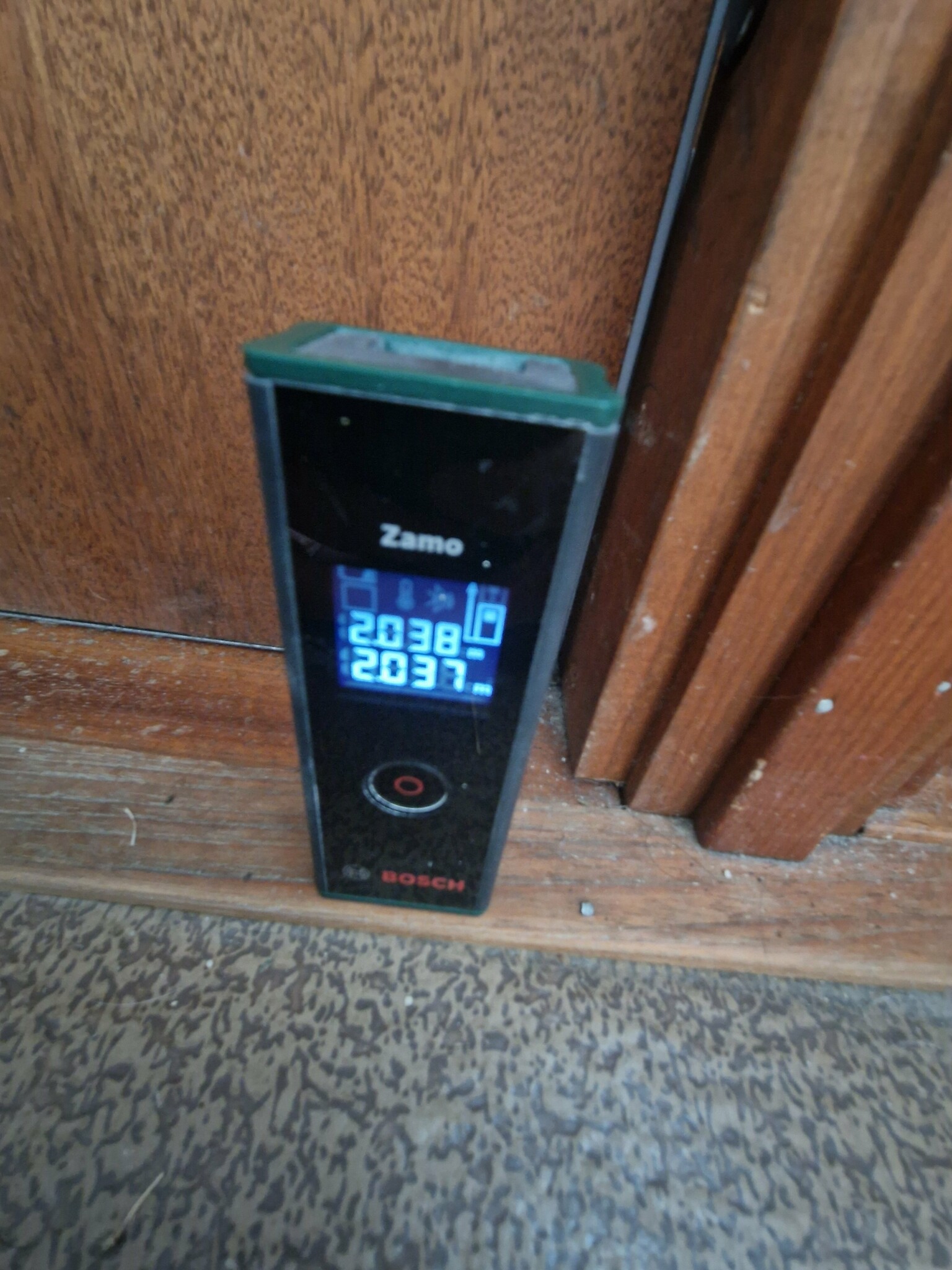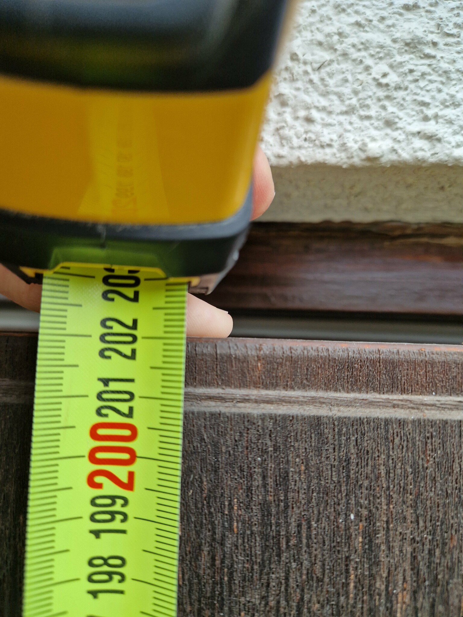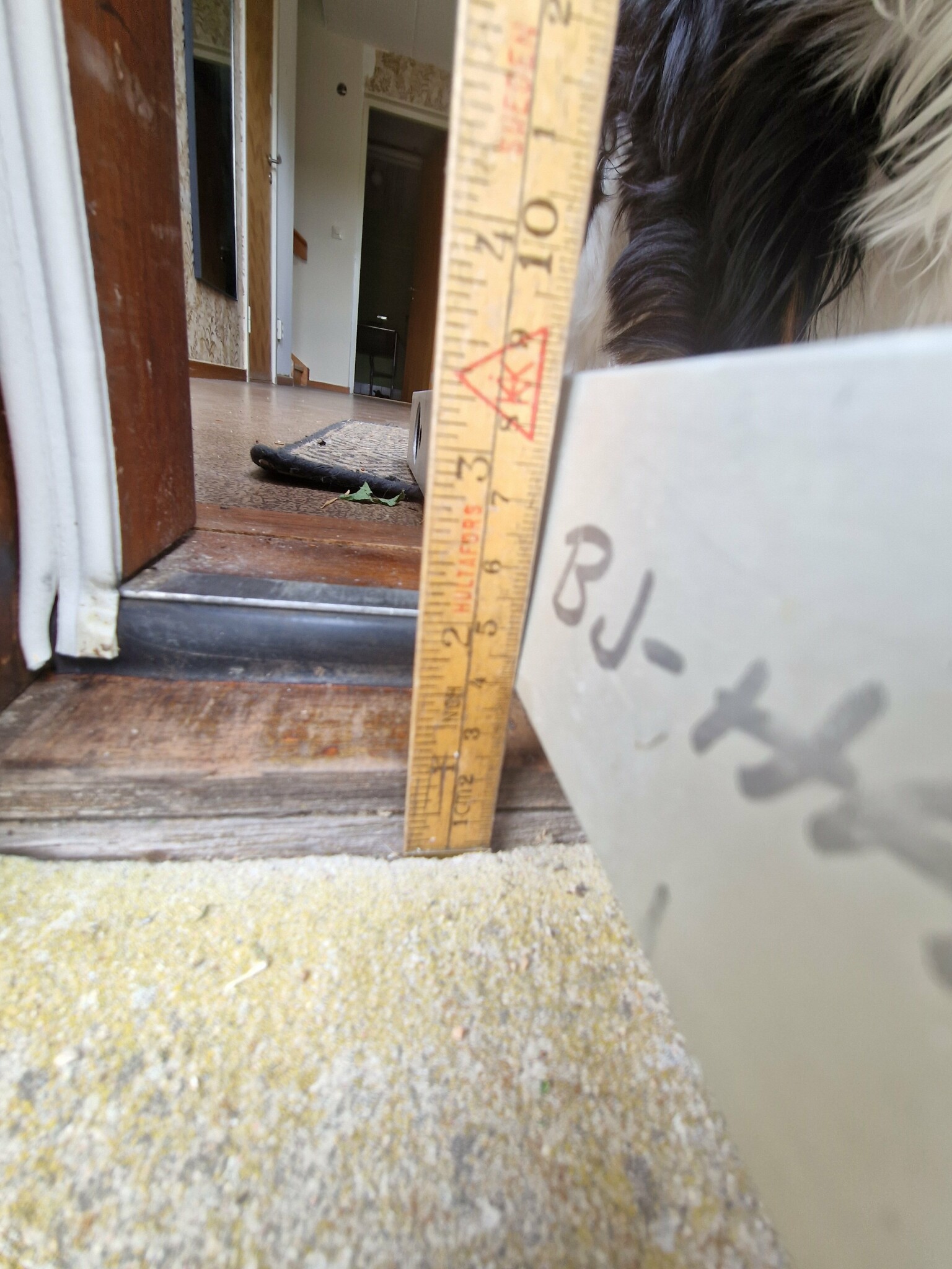 Lite det som är ett av problemen, finns inga utvändiga lister/foder utan endast någon form av fog. På insidan finns endast en tunn eklist 0,5 cm runt öppningen förutom vid tröskeln som nästan är i samma nivå som golvet. Dörrbladet är 198,5 invädigt eller 202 utvändigt.