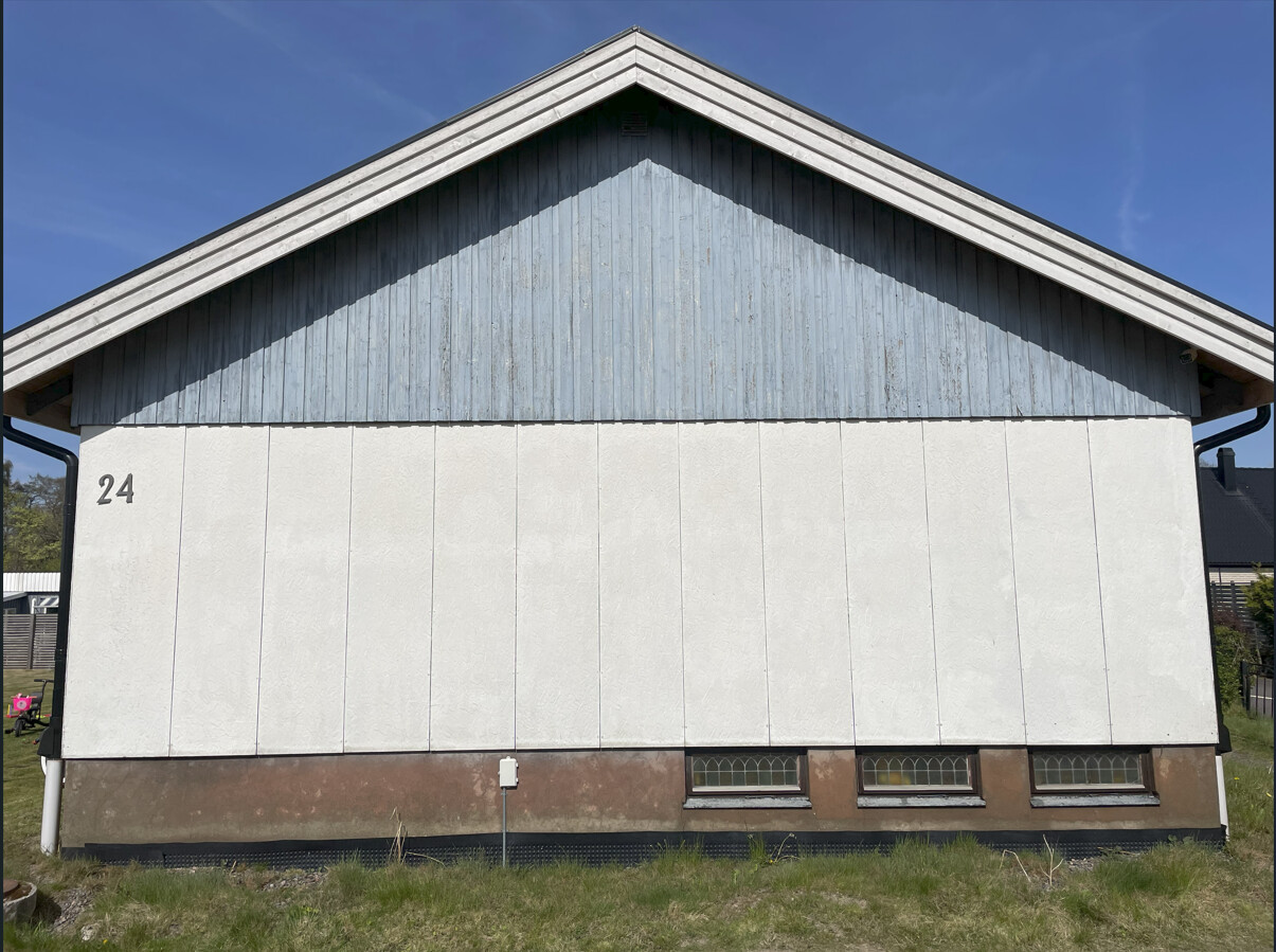 Tvätta hela fasaden med en vanlig fasadtvätt och mjuk borste. Sedan måla den med två lager av Fasadfärg NORDSJÖ Tinova Exterior vit. Denna färg skulle även gå att använda till den övre delen med trä.