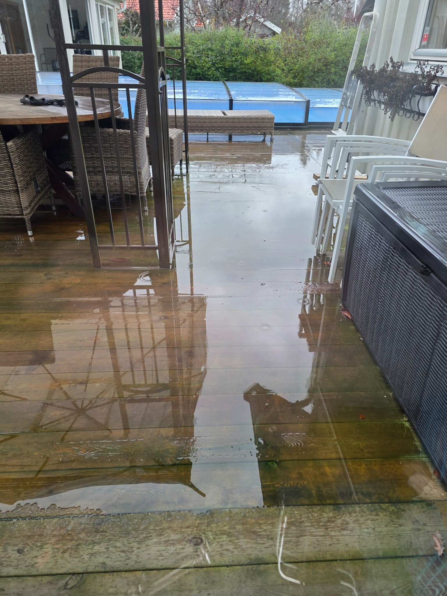 När vi lät bygga vår altan lade entreprenören nästan alla plankor (34x145 tryckimpregnerad trall) med konkava sidan upp. Som resultat har nu plankorna svällt så det inte är några springor kvar melan plankorna, så nu rinner inte vattnet av vilket gjort att plankorna skålat sig ännu mer.