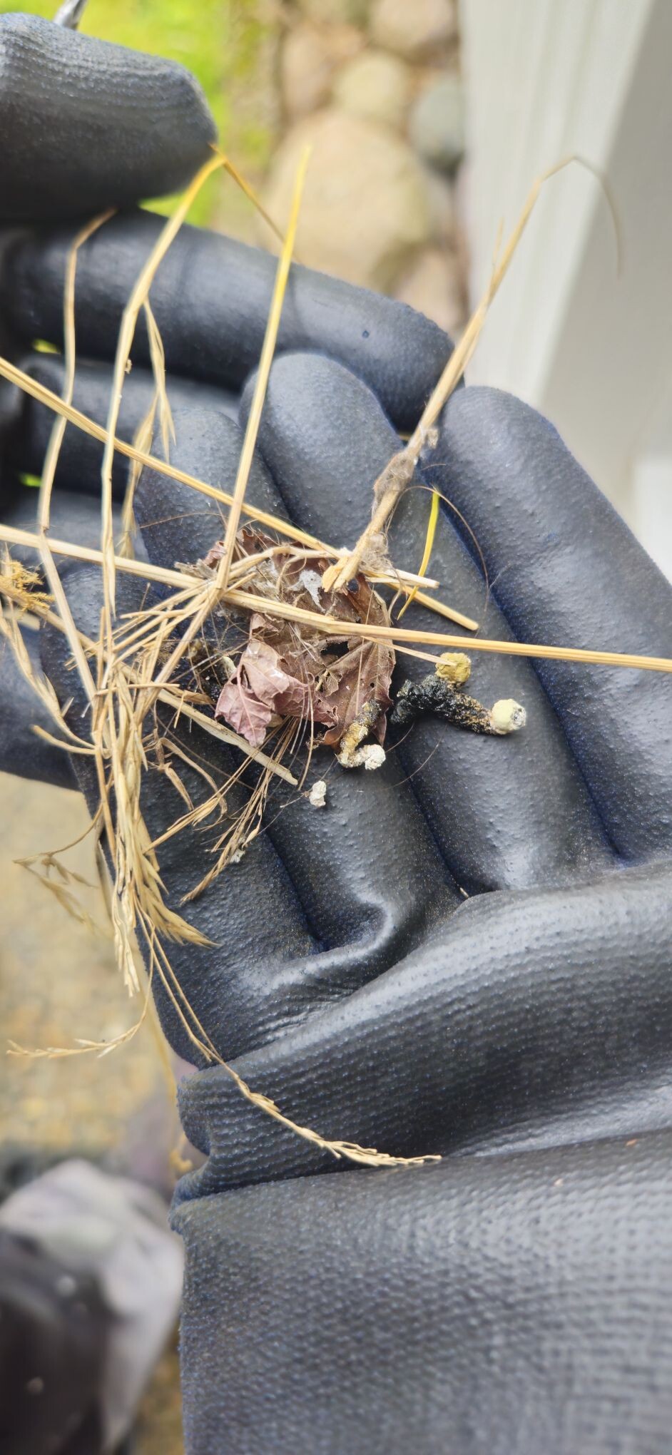 Gick ut dagen efter, kollade och såg vad jag trodde var ett fågelbo i slutet av takfoten. Det såg ut som en öppning på ca 5x2cm där jag hittade detta. Såg att denna "öppning" finns på alla fyra hörn av husets takfot.