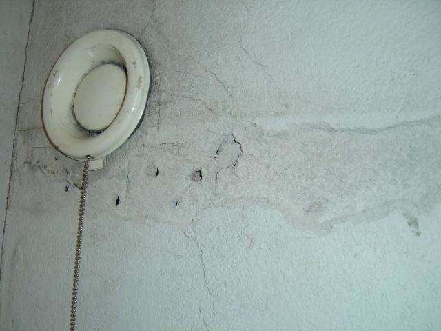 Jag har plockat ut en vägghylla ur en klädskrubb i bostadsrätten (byggd 1965). Hyllan var spikad med betongspik. På ena väggen finns en ventilationskulvert som har ett poröst ytskikt som spruckit lossnat. Jag har skrapat bort det mest lösa, men det är så poröst att jag inte vågar peta alltför mycket. Jag vet inte vad det är för ett material eller vad som är lämpligt att laga skadan med (se bilden). Jag lagade tidigare en liknande vägg med breplasta LH, men det var bara skador av en femkronas storlek.