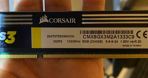 Tillägg: jag kan ju lägga till att minnena finns med på listan över kompatibla minnen för moderkortet (i princip, de exakt likadana 2GB modulerna finns med men inte dessa 4GB, men CMX8GX3M4A1333C9 och dessa som köptes vad CMX8GX3M2A1333C9)