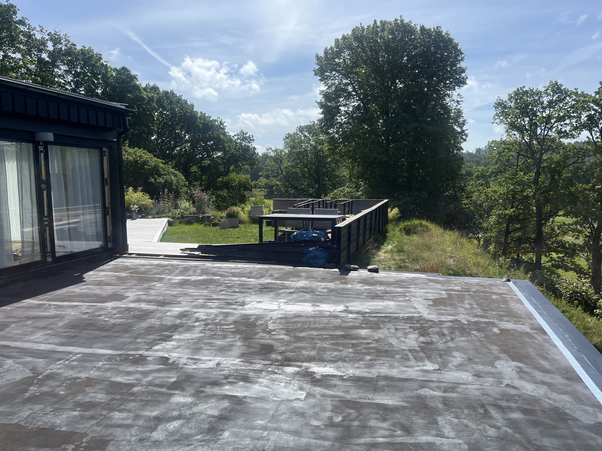 Okej. Så bort med allt ytskikt ner till betong. Slipa rent, gjuta upp ett fall och sen mer eller mindre bränna takpapp på?S Sofbor skrev:Beslutet blev till slut att istället för betongyta (med tex weberrep) att täta hela ytan med webertec 913 (tätskiktsmatta och tätskiktsremsa) och lägga trall ovanpå. Behövde täta mot fasad (remsa) och likaså få till bra avrinning (kantplåtar) så trall på minimal läkt blev bäst.