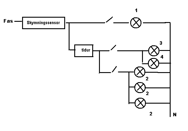 Grundtanken är att ha ett skymningsrelä som tänder på eftermiddagen/kvällen och ett tidur som släcker mellan midnatt och sex på morgonen. Belysningen tänds på ungefär 50% ljusstyrka och då någon rörelsedetektor (Nexa för att slippa kabeldragning) detekterar närvaro tänds ljuset till 100% under ett par minuter. Dessutom tänkte jag sätta Nexas magnetkontakter på entré- och källardörr så att ljusstyrkan ökas direkt då man öppnar dörren för att gå ut.