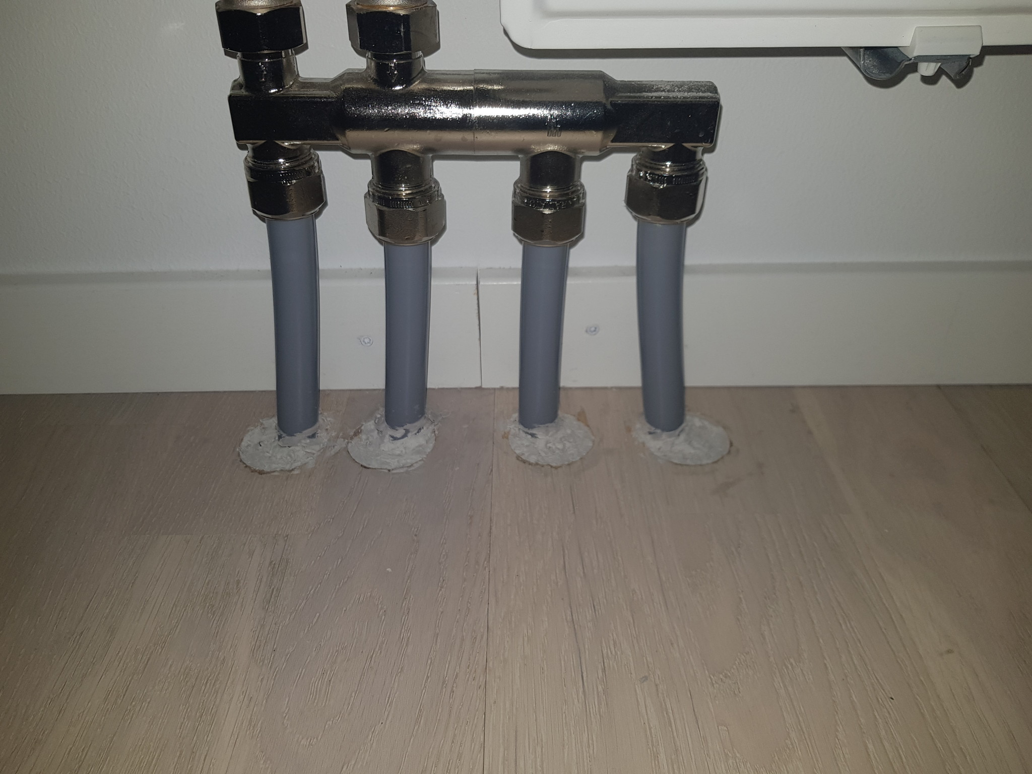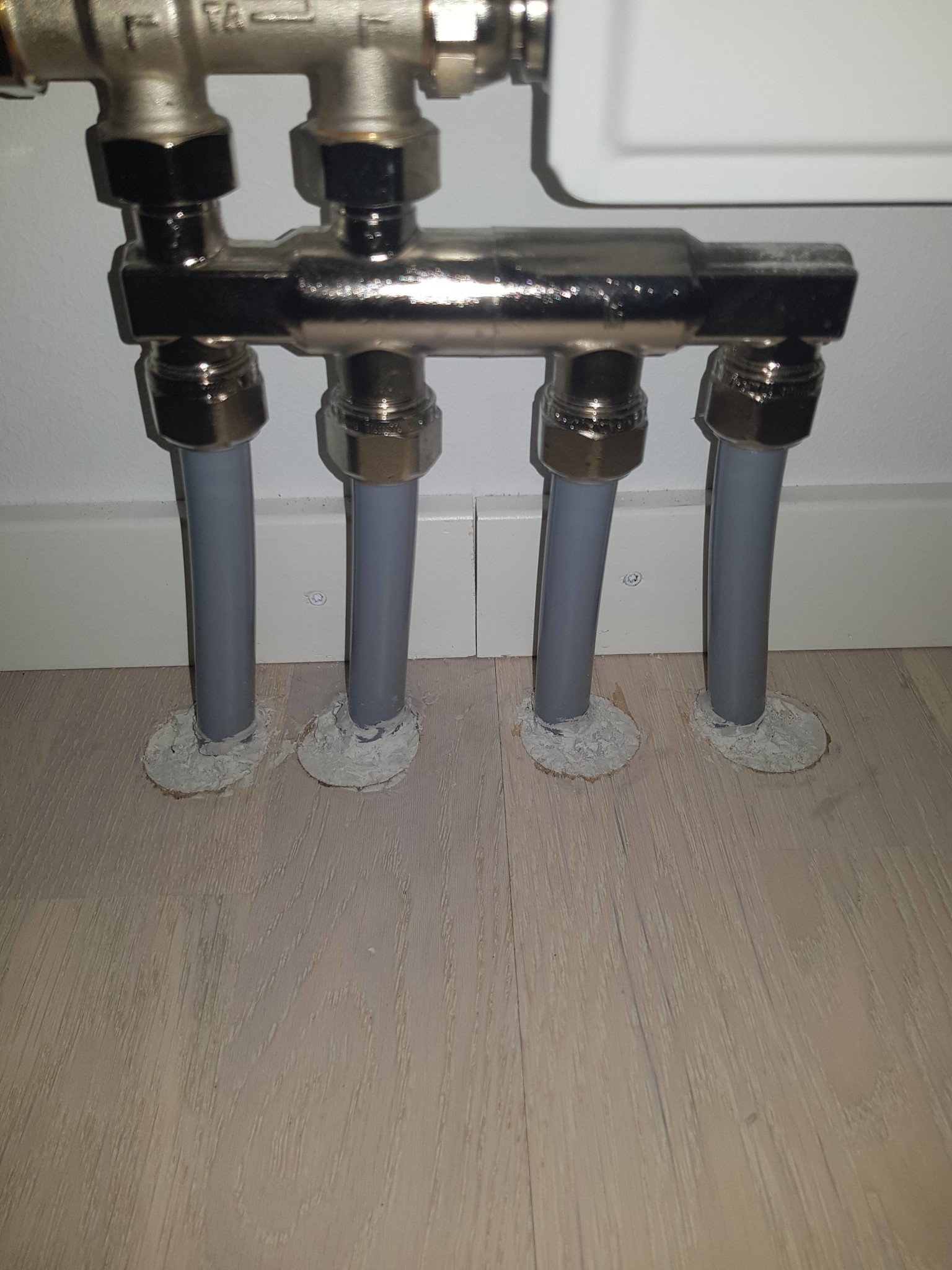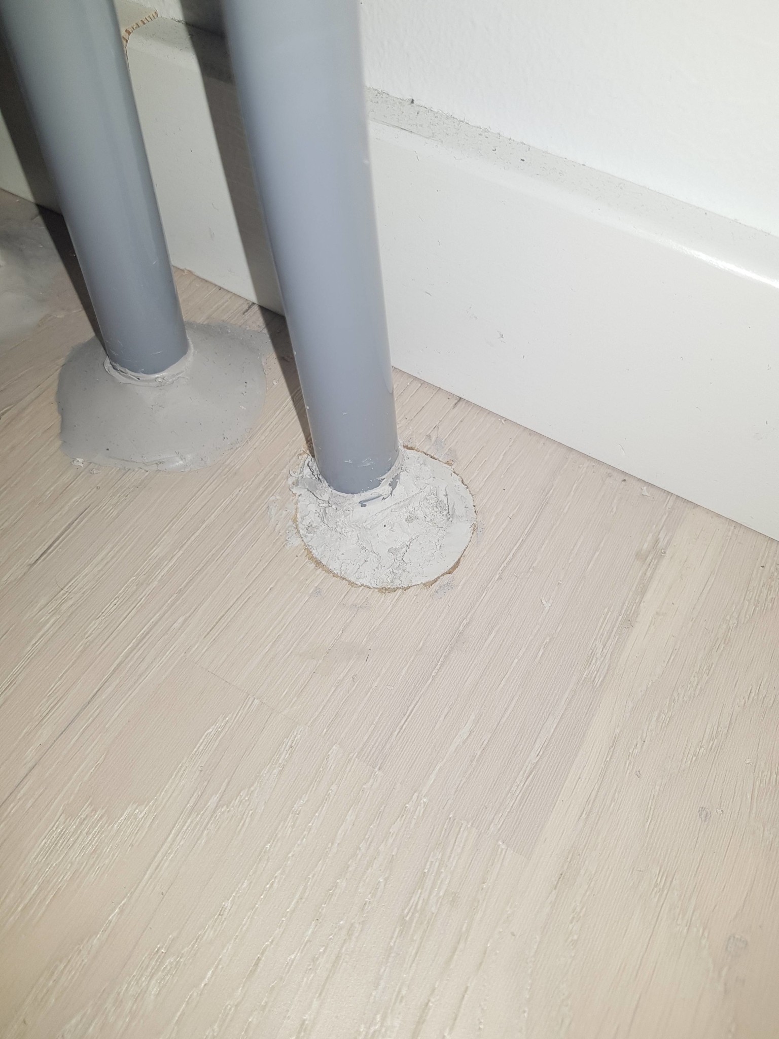Det var som jag misstänkte. Under mjukfogen har de kvalificerade hantverkarna gjort ett sånt stort hål i golvet att troligtvis två eller tre elementrör får plats i hålet.