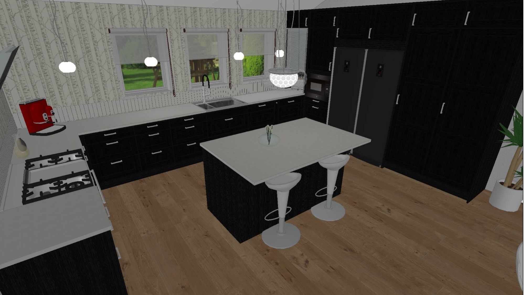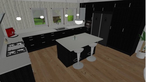 Sedan har vi valt Vedum kök med en svart målad eklucka, bertazzonispis och sten ( eller typ silestone) skiva till köket.