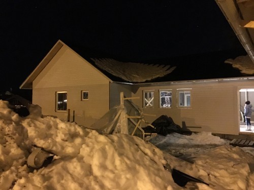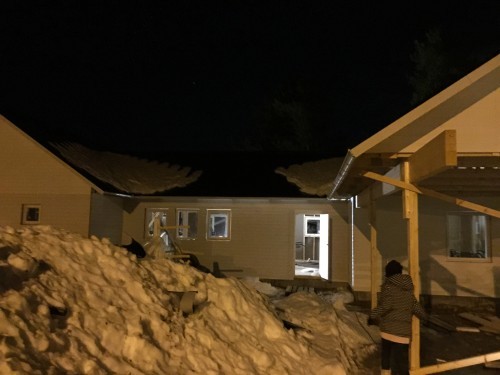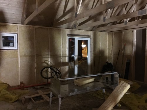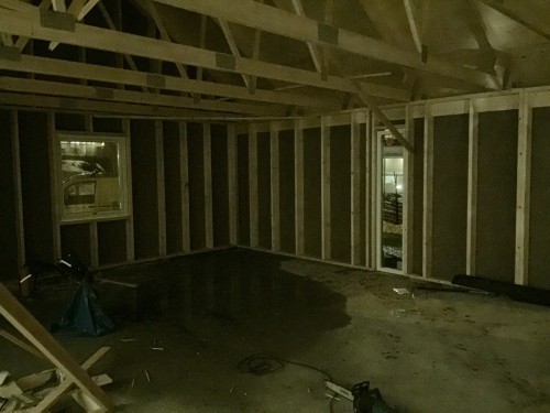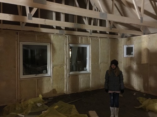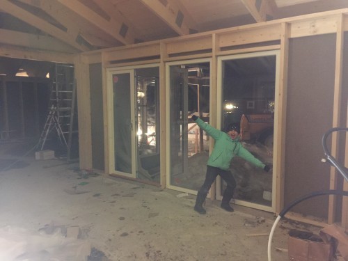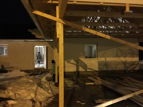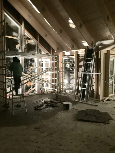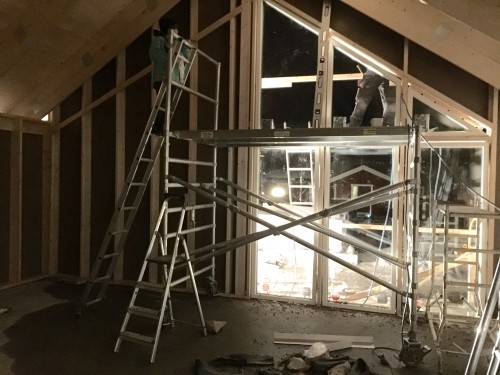 I måndags började byggarna slita på igen. Fönsterna skulle ha kommit den 19e januari men det blev inte ;-) så den här veckan bör de komma. Snickarna håller just nu på att färdigställa ytterväggen (slå klart allt som ej blev igenspikat före jul).