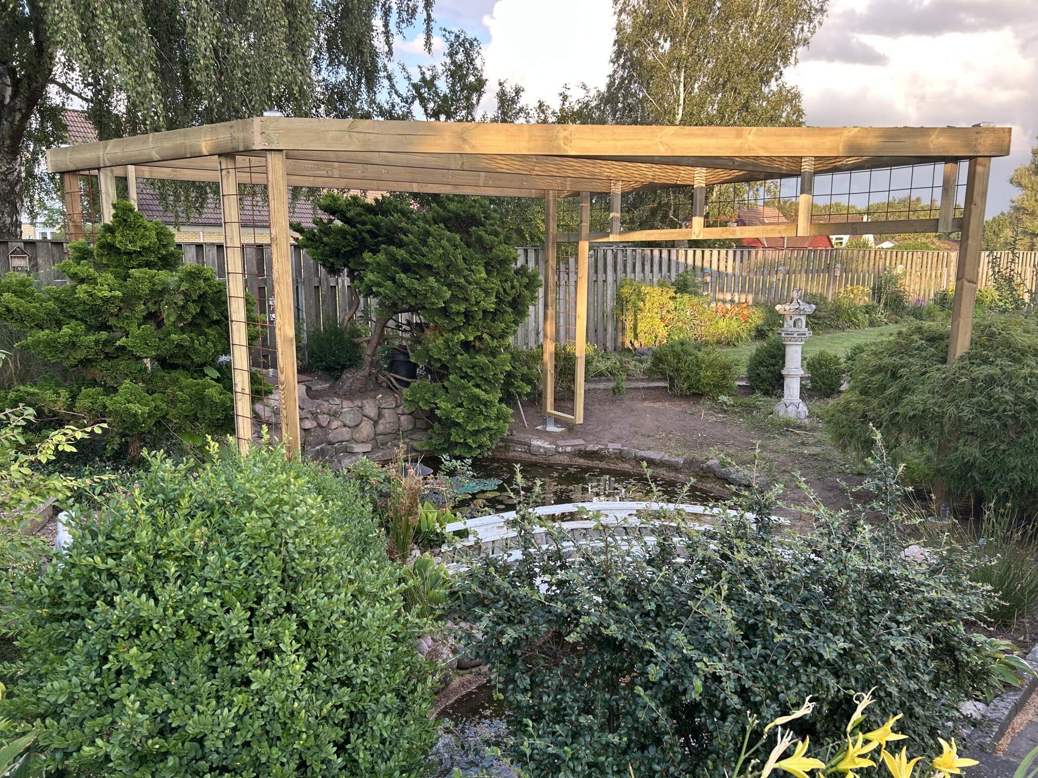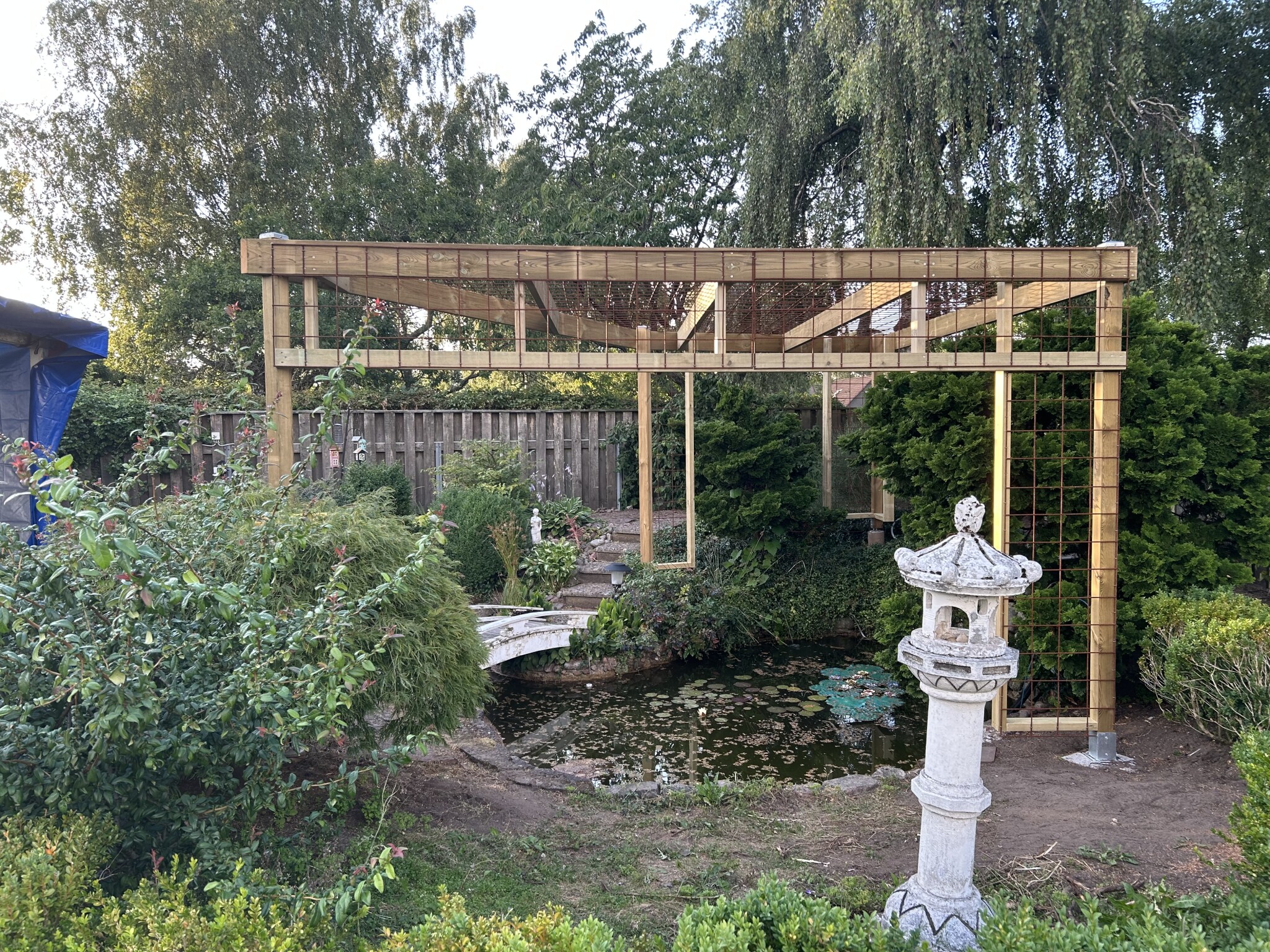 Detta hade hon fått för sig. Nu ska det bara upp armeringsmattor och murgröna/blåregn som ska göra ett ”tak” över dammen så den inte blir så varm