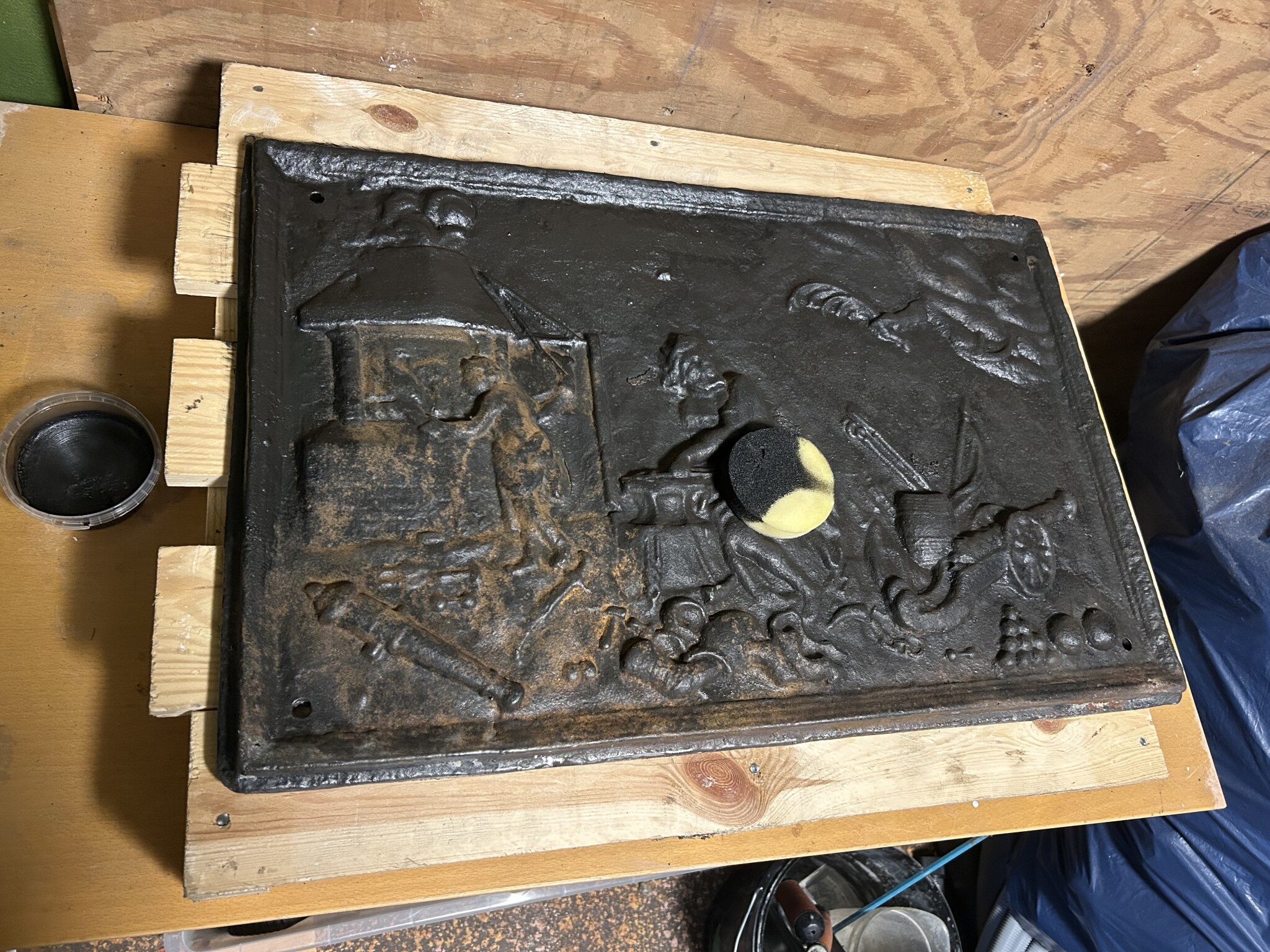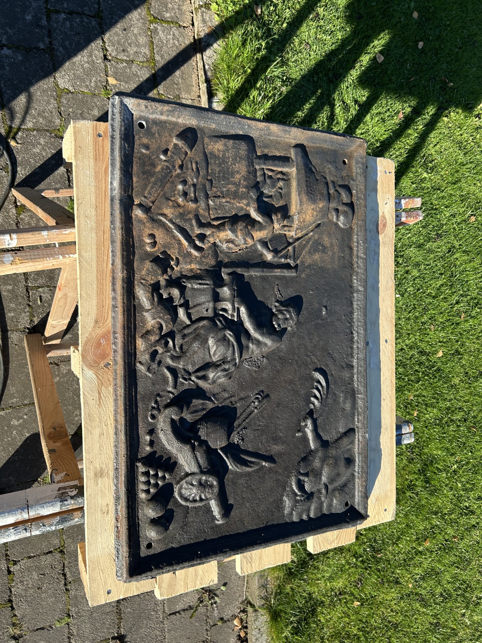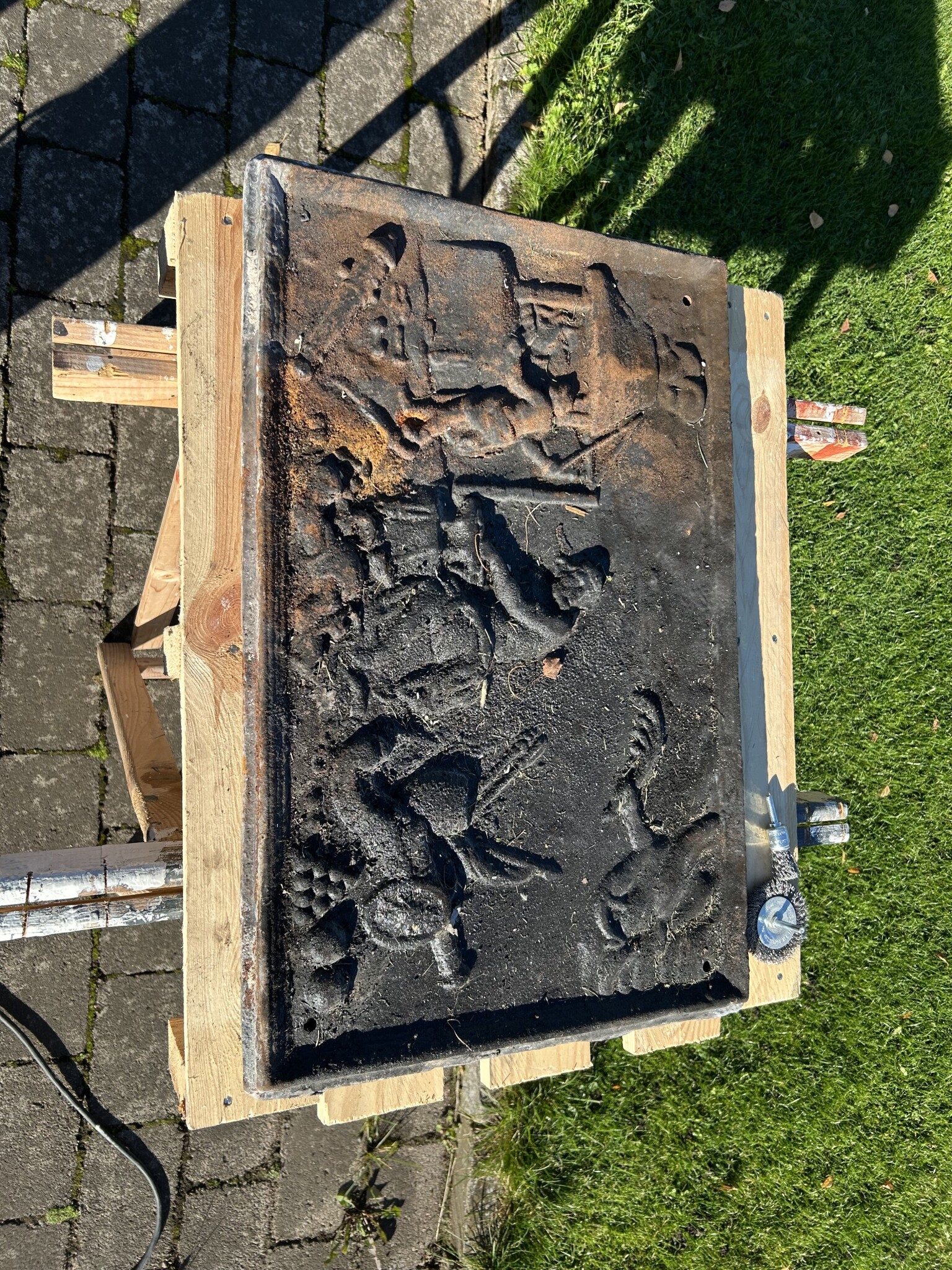 Vi har tänkt att spara sättungsplattan från den gamla öppna spisen och mura in den bredvid insatsen för att knyta ihop husets ”historia” lite. Idag har jag borstat ned den så den är redo när de väl kommer.