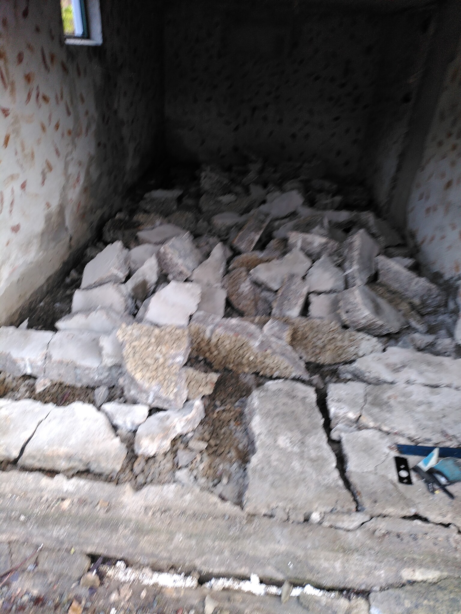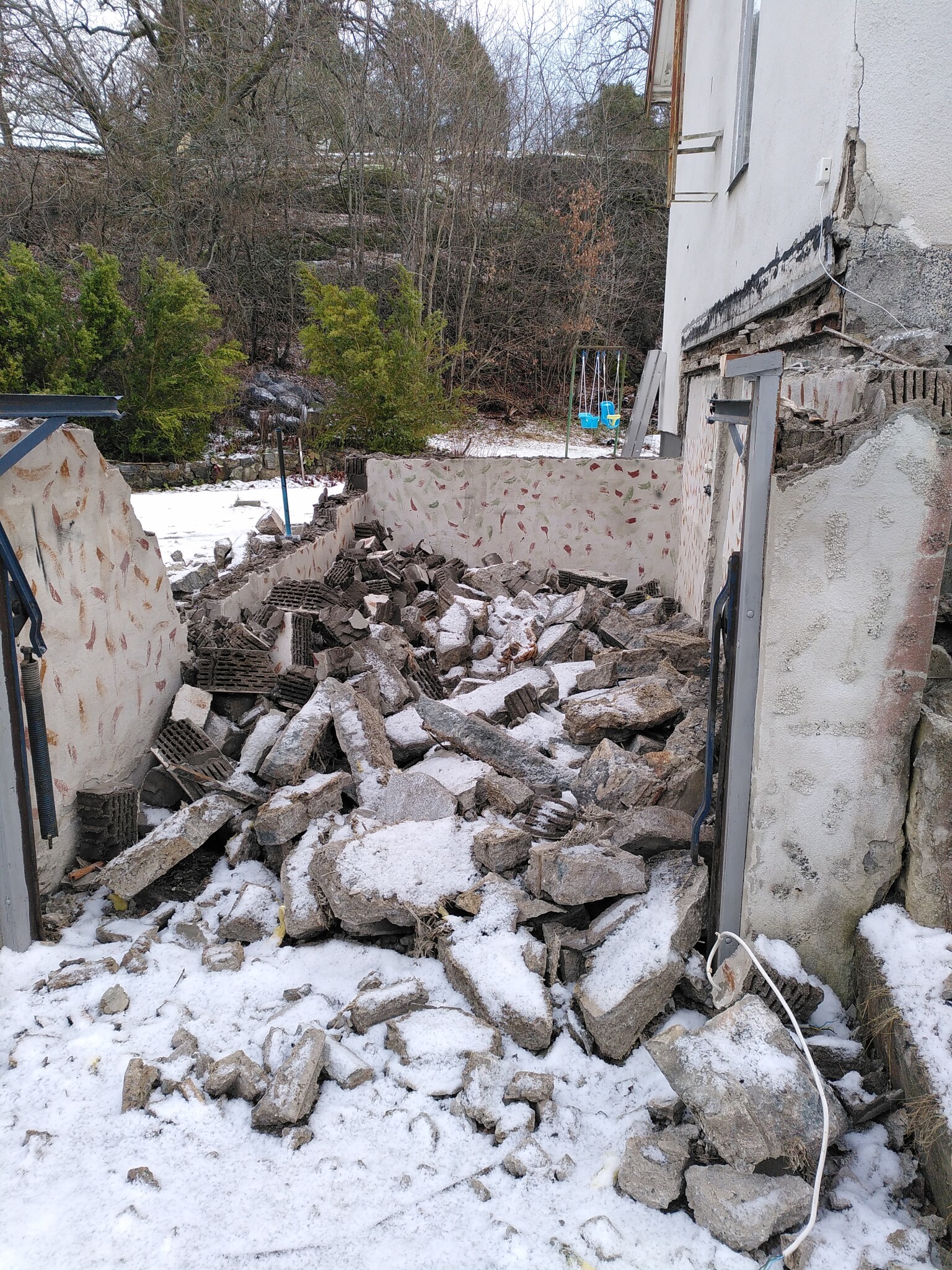 Taket innehöll lite armering och vilade på några (typ fem sex, minns inte exakt) stålbalkar. Dessa i sin tur vilade på en U-balk som satt i husets syll med sju (7!) franska skruv. Men det gav vika till slut också för spräckkilarna och spettet.