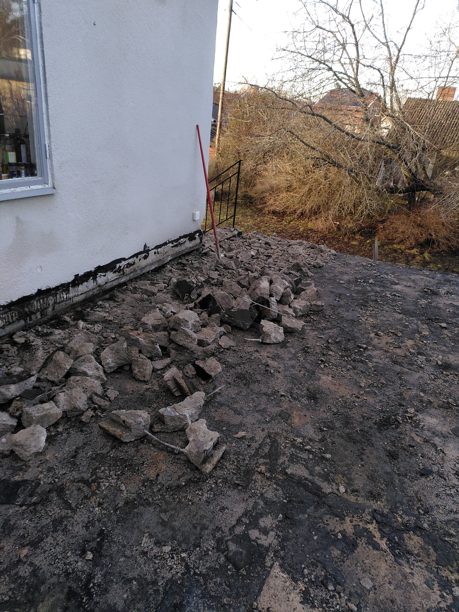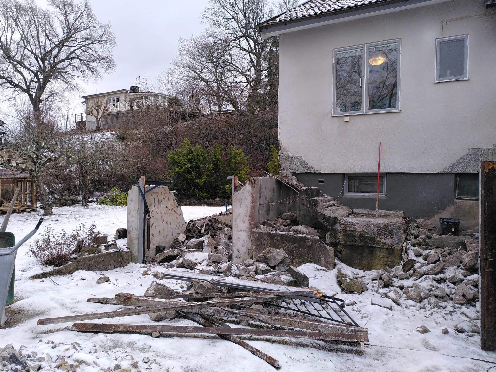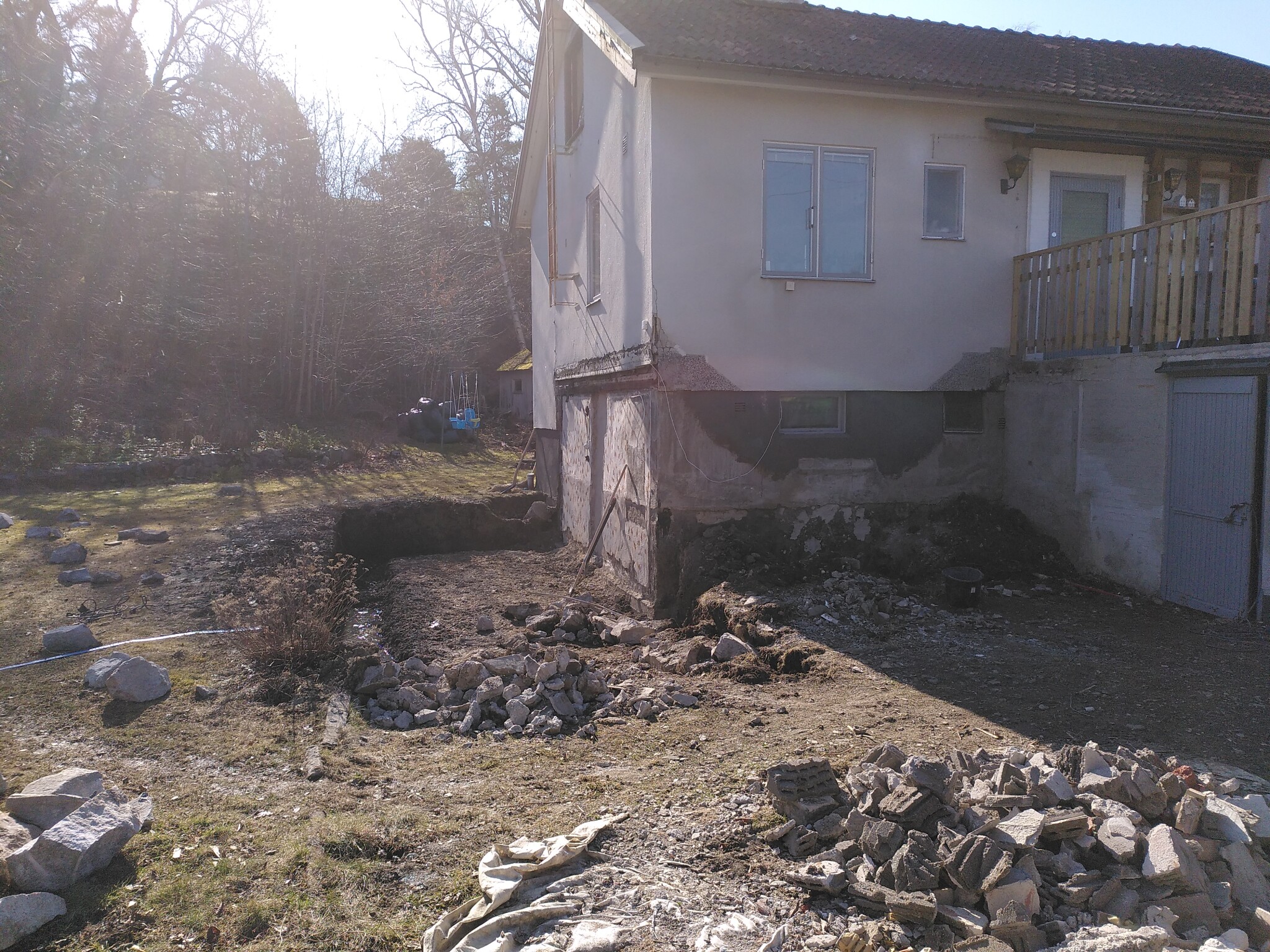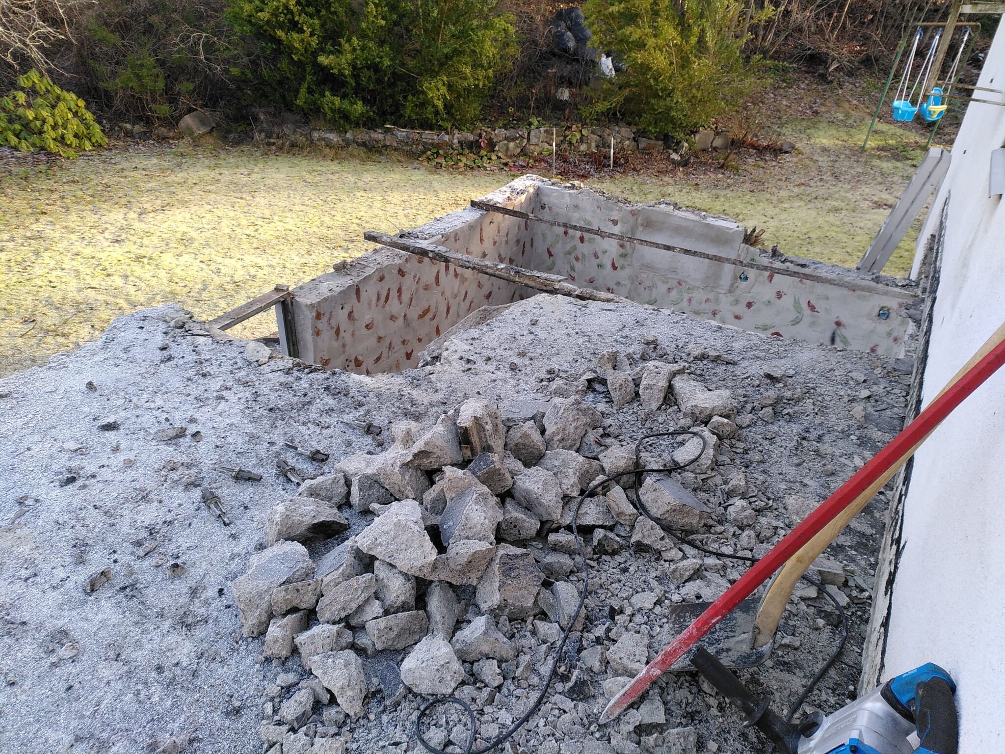Då var det dags att ge sig på trapporna. Betongkumpen i mitten hade jag tänkt mig att den skulle vara ihålig och fylld med grus typ. Det var den inte. Det var solid betong och sprängsten ungefär 1,5 m ner. Blandat med allsköns skräp. Jag tänkte också att rampen framför garaget var sådär 10 cm tjock. Det var den inte heller. Den var typ 60 cm tjock. I klumpen mellan trapporna och rampen framför garaget hittade jag minst tre cyklar (i delar), en torkställning, ett leksaståg i plåt, en liten leksakslastbil plus ett antal ton sprängsten som jag inte vet var den kommer ifrån, för det har inte sprängts något på den här tomten vad jag kan se.