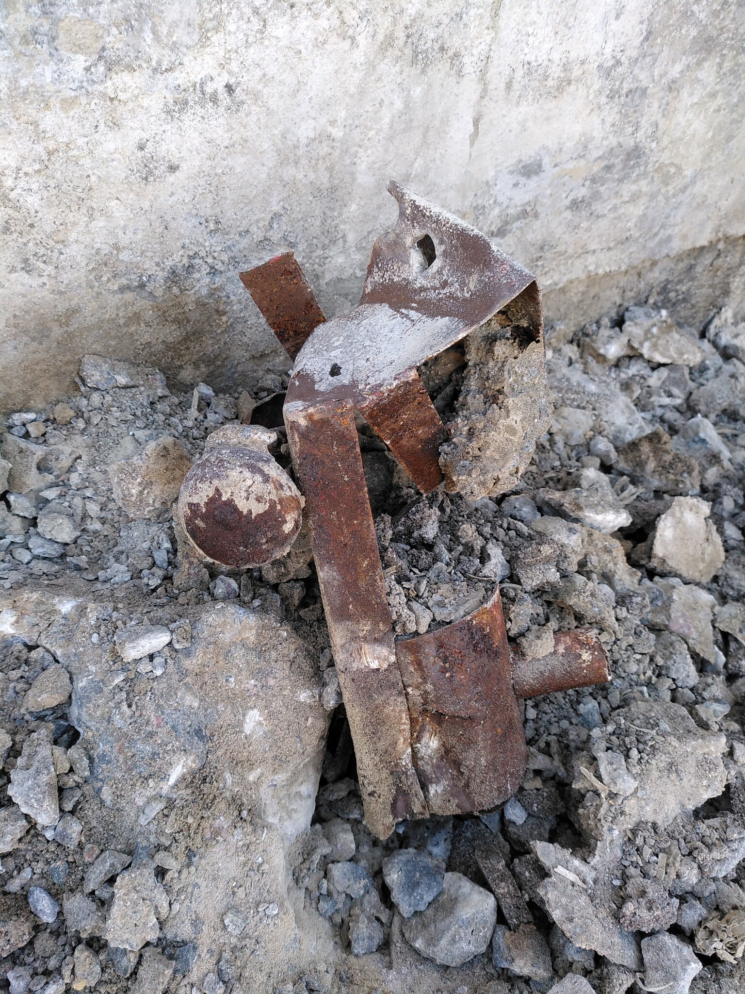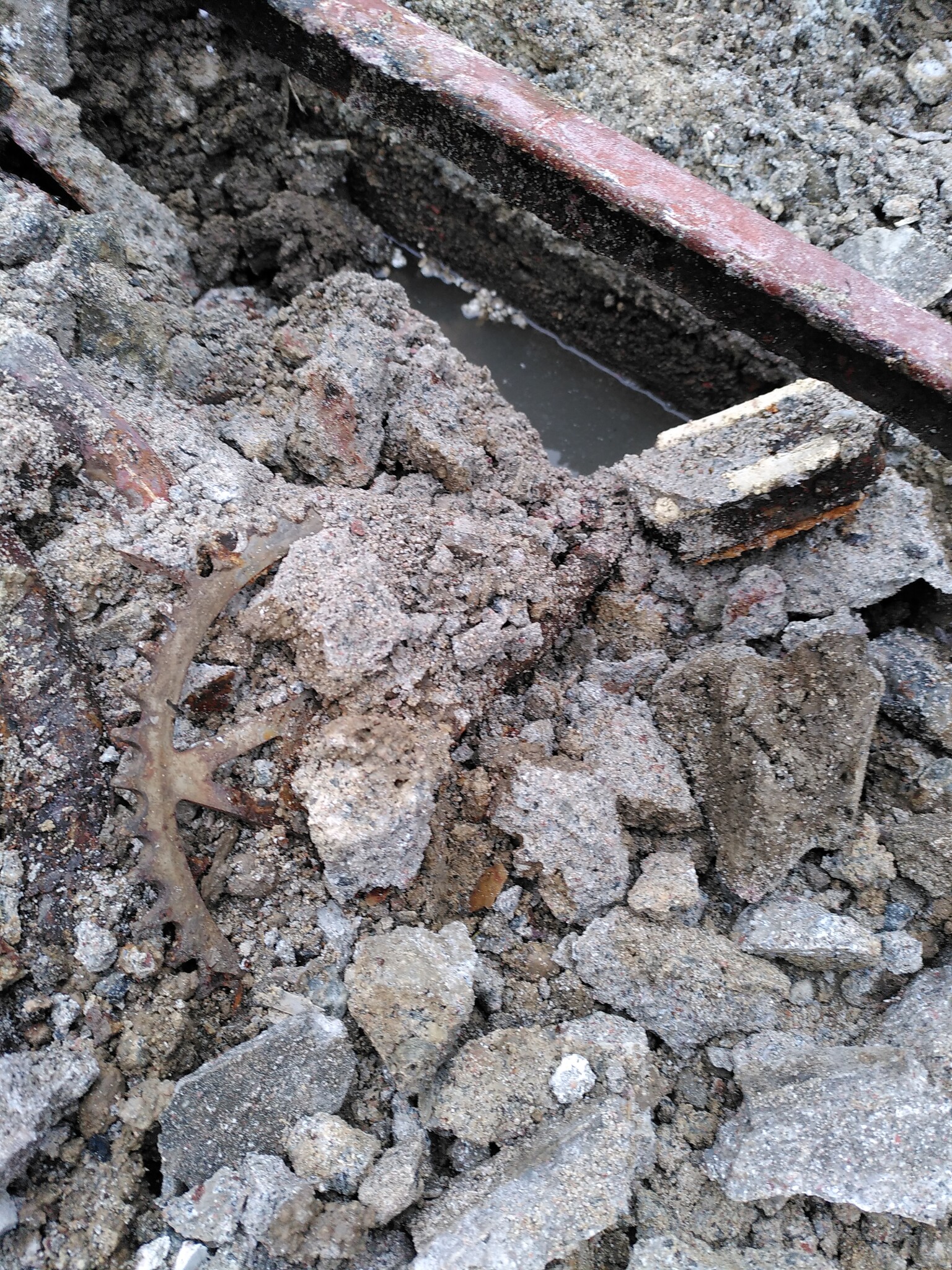 Här tittar ett drev fram i betongen! Det värsta var hjulen. Eftersom ekrarna var i rostfritt var de i bra skick och agerade som en fullkomligt överjävlig armering, så jag fick klippa av dem en och en med hovtång för att kunna spätta loss bitarna.