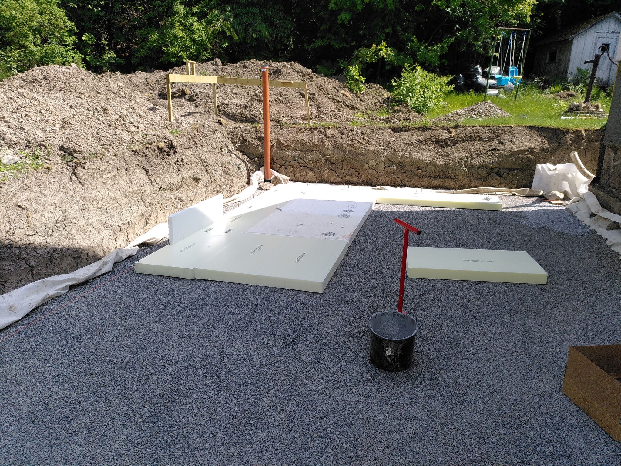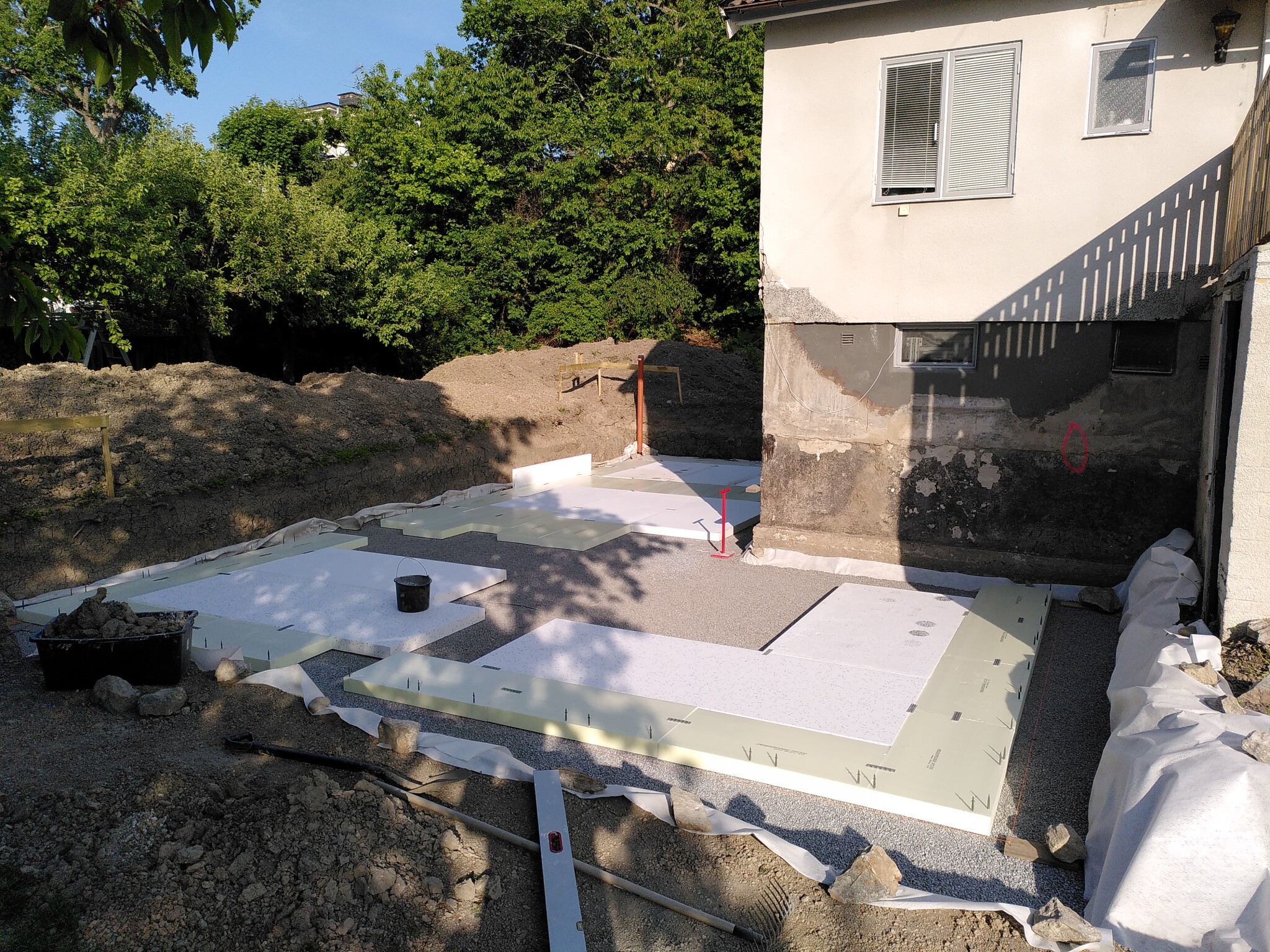 Den gulare cellplasten är XPS300 under voter. Resten är EPS100. 30 cm blev det. Hade egentligen tänkt lite mindre, men schaktgropen blev lite djupare än vad jag tänkt, så då blev det så. Jag skippade färdiga kantelement eftersom det ändå är under mark och det kommer ett lager pordrän utanpå.