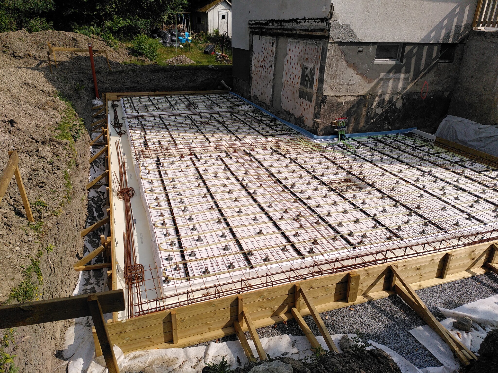 Sedan armering, form och golvvärme. Jag gjorde en liten extra förstärkning av plattan mitt under den balk som skall bära mellanbjälklaget. Då kan jag sätta upp en stämp för att styva upp bjälklaget ifall man vill ha särdeles vilda fester någon gång.