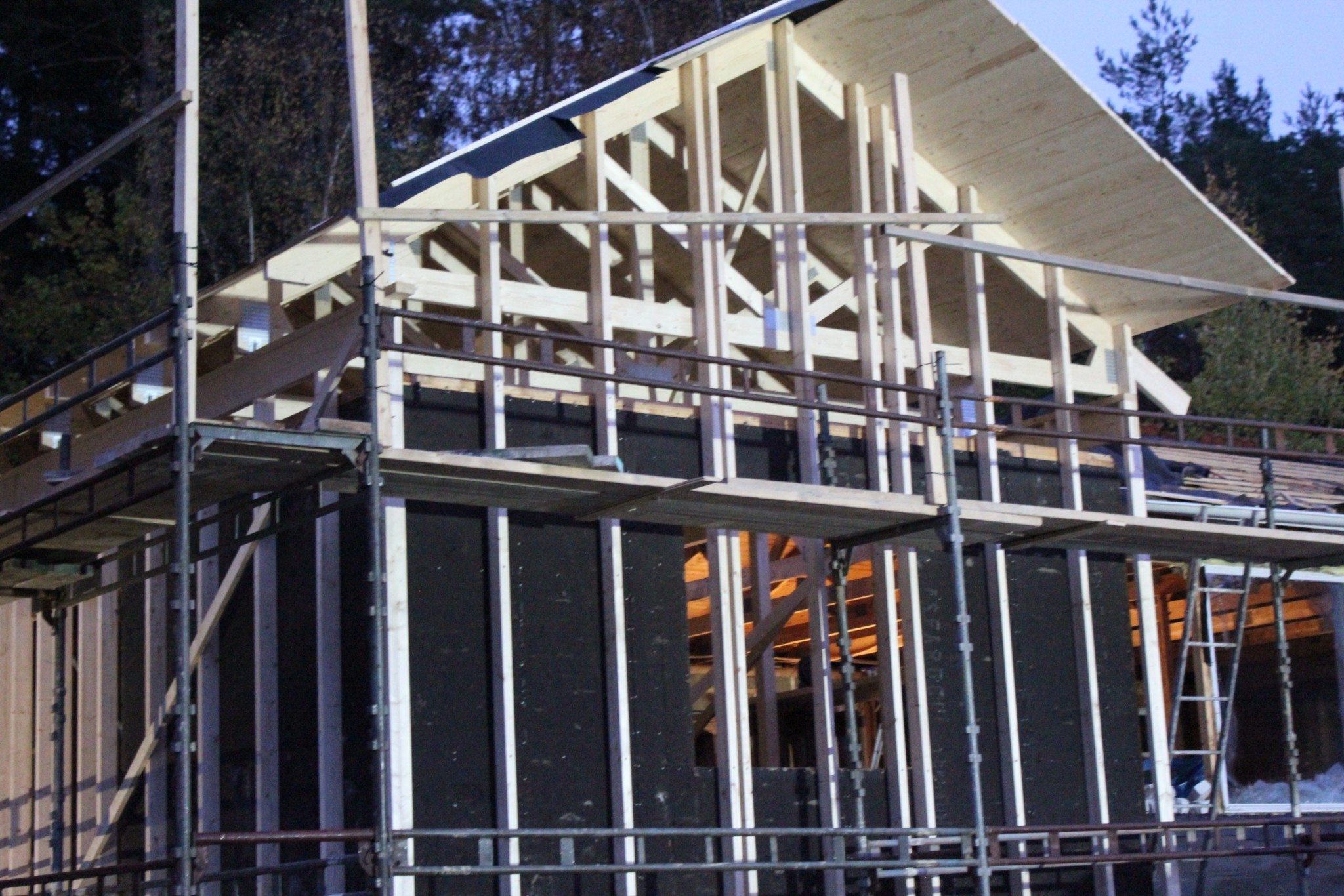Nu har vi reglat på nya väggar och takstolarna är på plats samt råspont och papp!