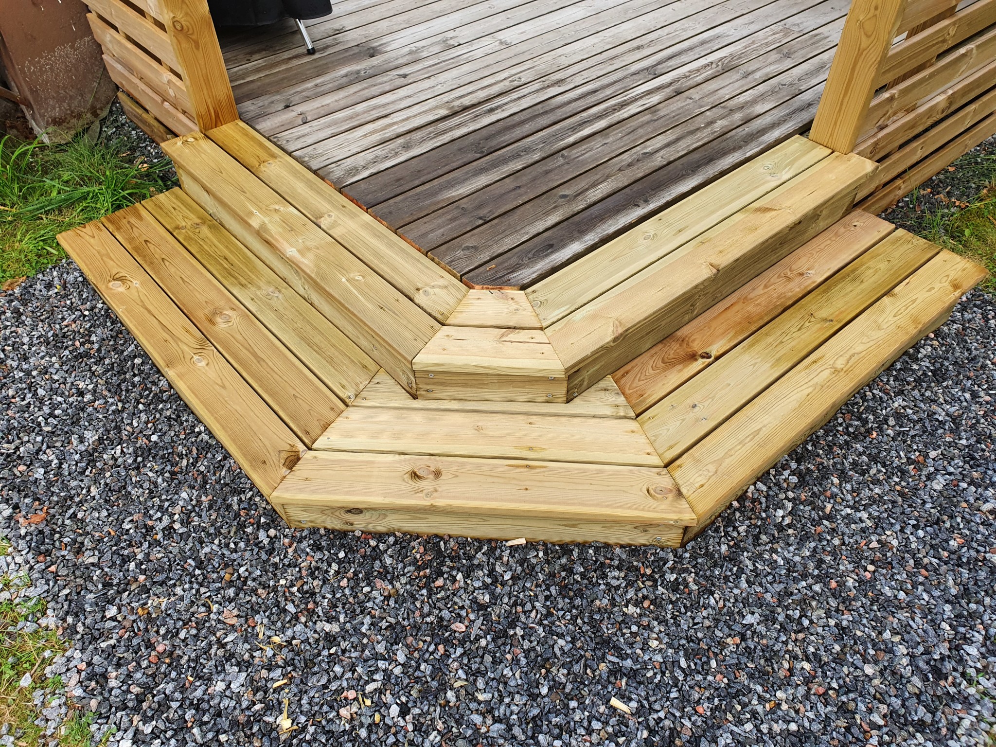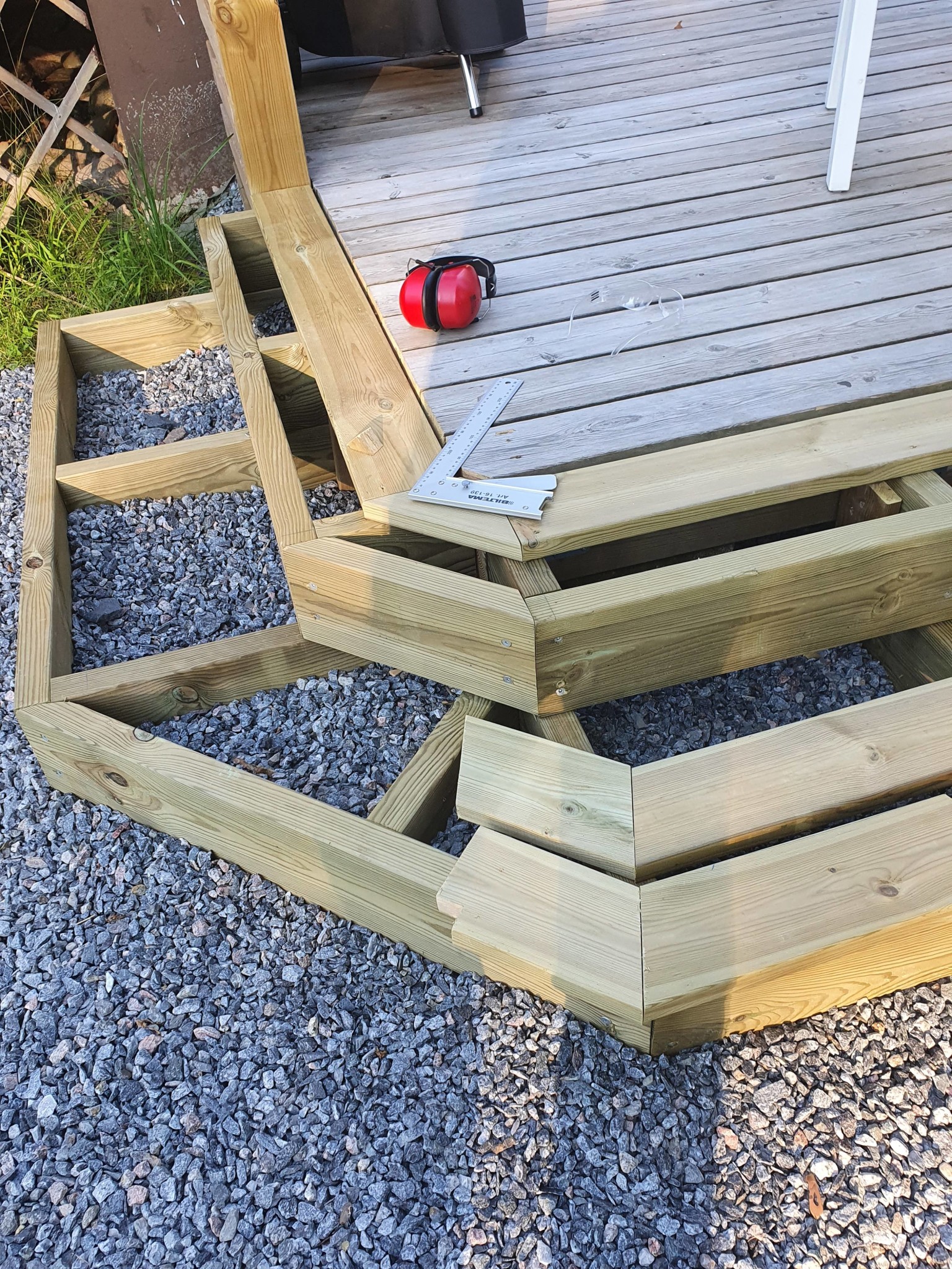 Häller på att göra en trappa med brutet hörn till mitt gamla trädäck.