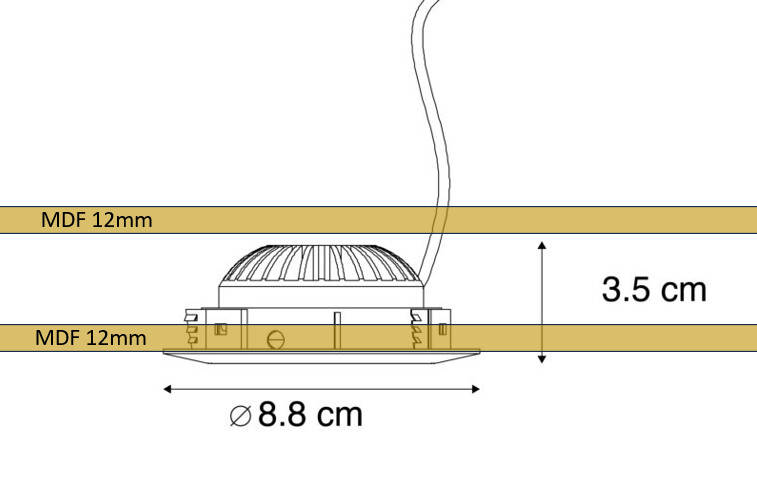 Ska bygga en monter och letar efter vinklingsbara spottar med låg bygghöjd (3.5cm måttet i bilden nedan, bild tagen från nätet, vill ha ner detta mått så mycket som möjligt). De ska även klara att byggas in mellan två MDF-skivor som i bilden. Helst något sorts trepack med tillhörande drivare.