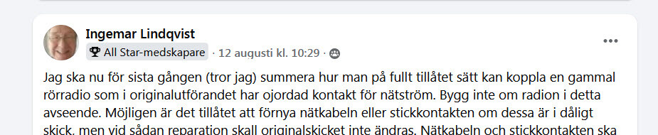 Jag ska nu för sista gången (tror jag) summera hur man på fullt tillåtet sätt kan koppla en gammal rörradio som i originalutförandet har ojordad kontakt för nätström. Bygg inte om radion i detta avseende. Möjligen är det tillåtet att förnya nätkabeln eller stickkontakten om dessa är i dåligt skick, men vid sådan reparation skall originalskicket inte ändras. Nätkabeln och stickkontakten ska fortfarande vara av samma ojordade slag som de var från början.