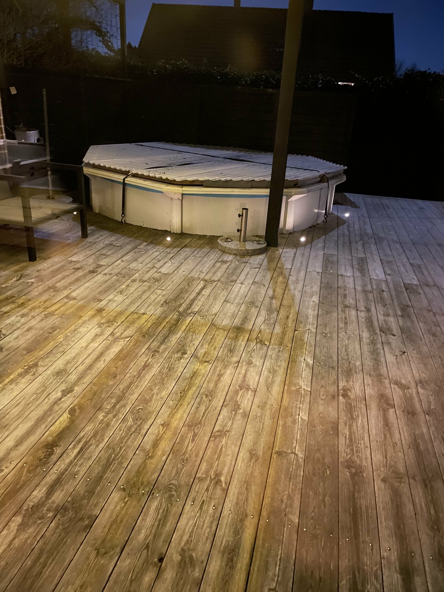 Min tanke är att tömma ur vattnet till under inloppet sedan täcka med det täcket man fick till, efter det bygga ett tak av korrugerad plast som läggs över och fäst på något sätt i trädäcket.