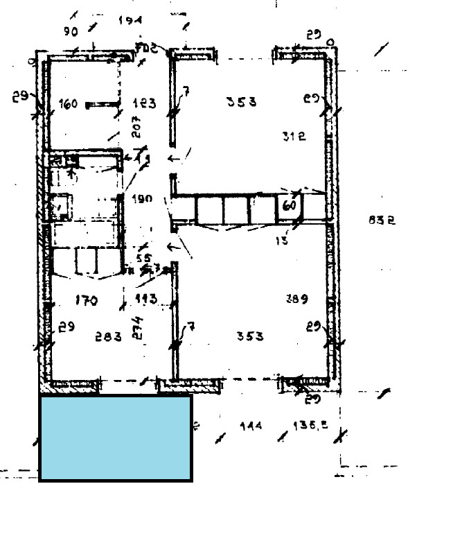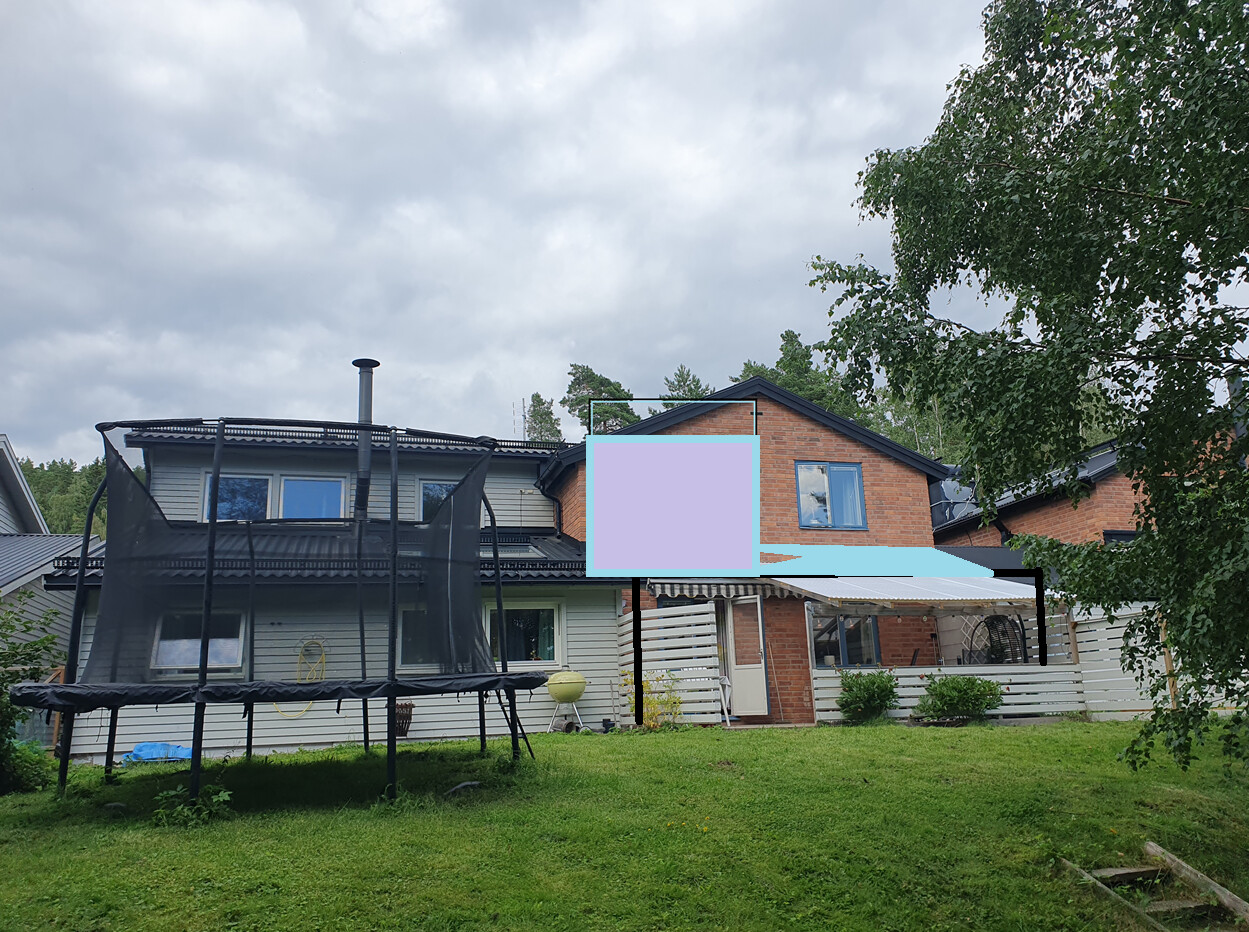 Sätta upp två stolpar på varsin sida om altanen, sedan dra en fet stålbalk över hela altanen (7 meter, blir väl en 25 cm stålbalk eller något). På stålbalken så gör man ett vinterisolerat uterum (lila rutan på bilden) med golvvärme. Värme behövs då radiatorn under fönstret i befintlig rum försvinner. Samt ett glastak i klarglas över altanen. Uterummet kommer då ut ca 2,5 meter från huset. Det befintliga plasttaket (4 meters skivor) förvinner helt och ersätts av ett tak i klarglas. Altanen förlängs ut på gräsmattan ca 2-3 meter för att göra plats för en liten pool eller ett spabad.