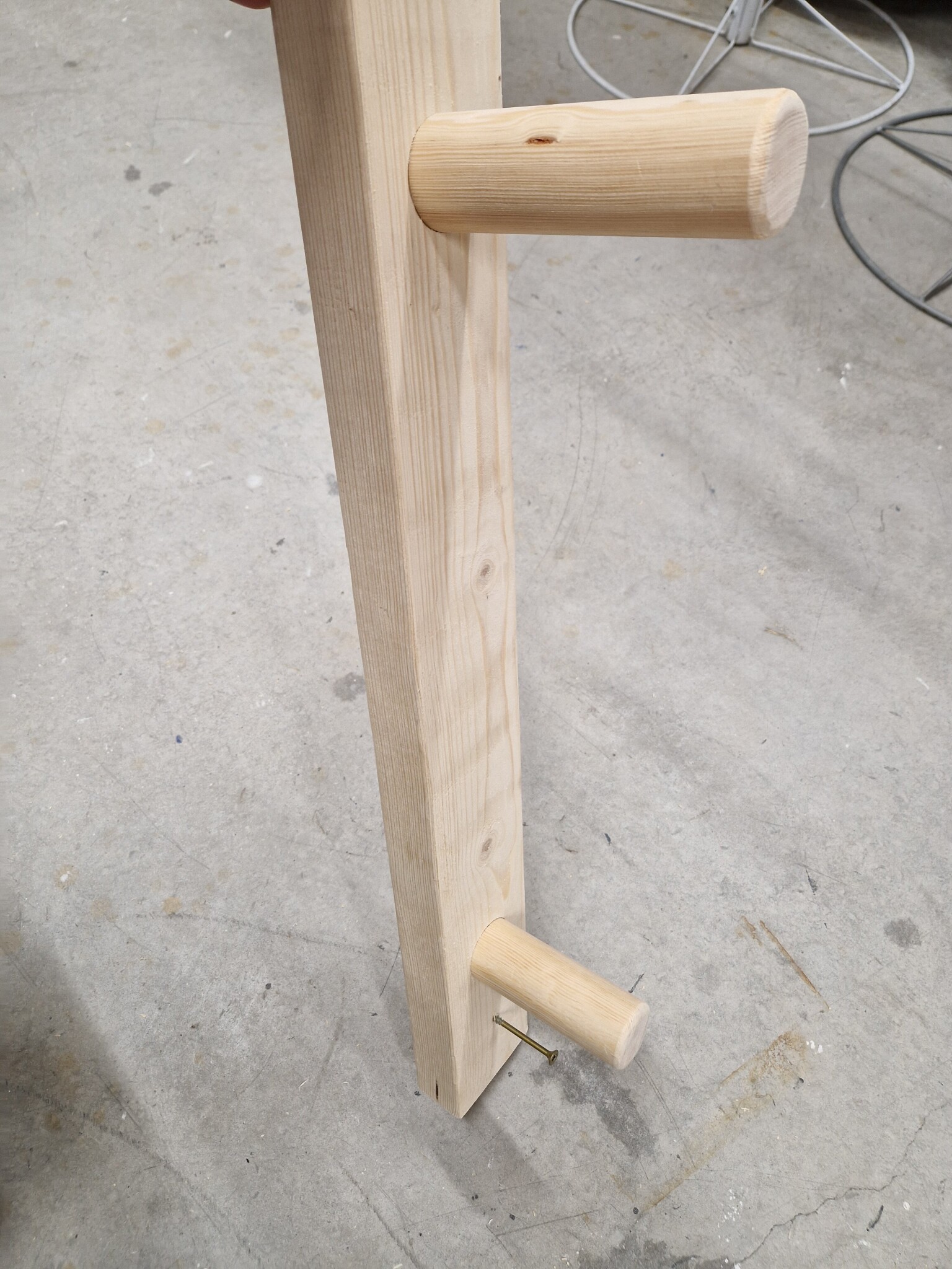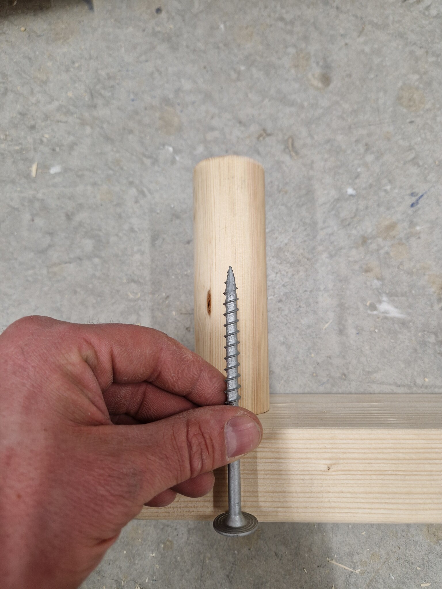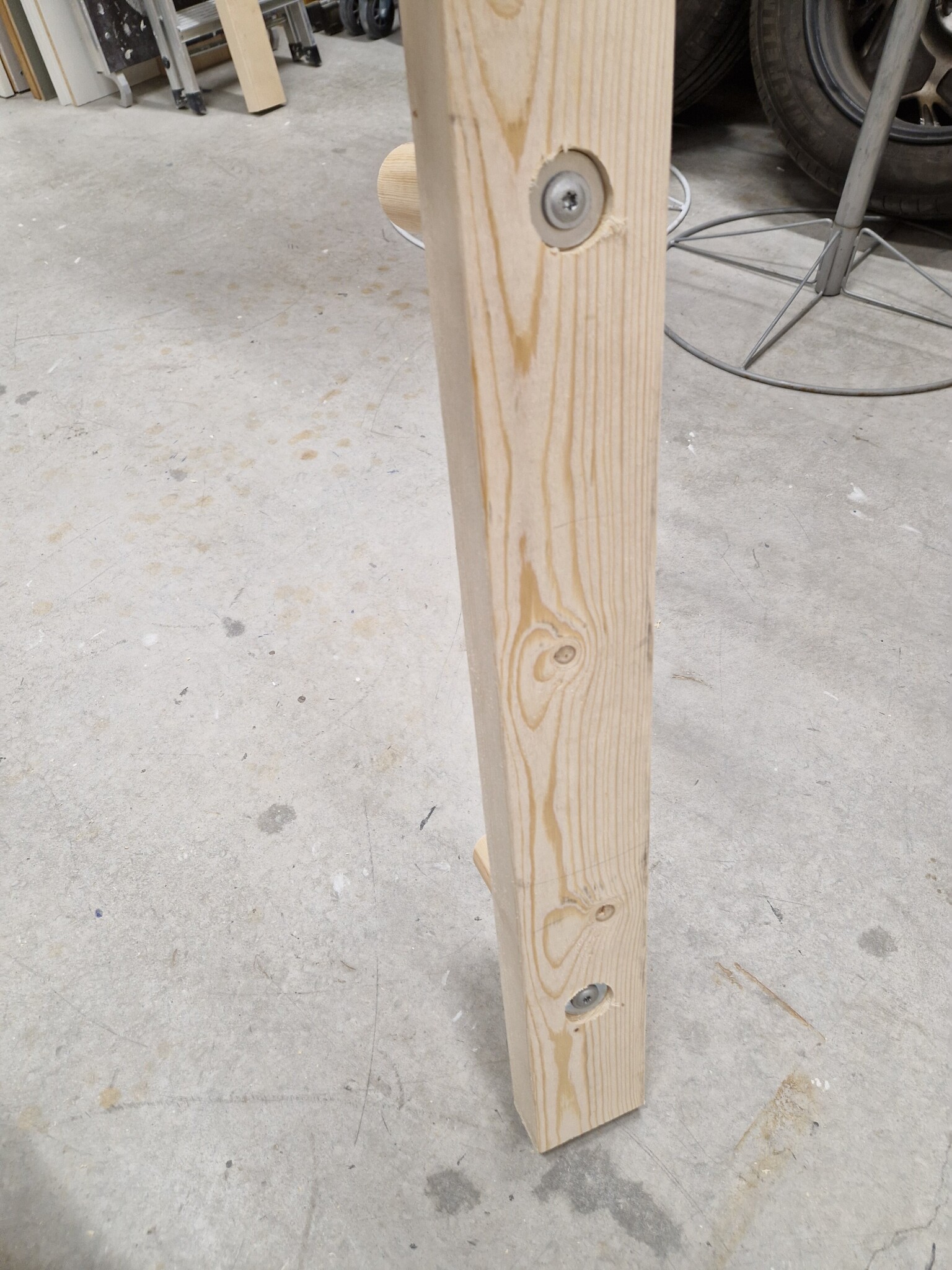 Spontant ser jag enda svagheten om underkant rundstav börjar pressas in i träet på väggregeln så att den sakta börjar luta neråt. Tycker dock det är så stor anliggningsyta så att det inte borde ske, men vi får se! Får väl sätta en stor metallbricka mellan i så fall.