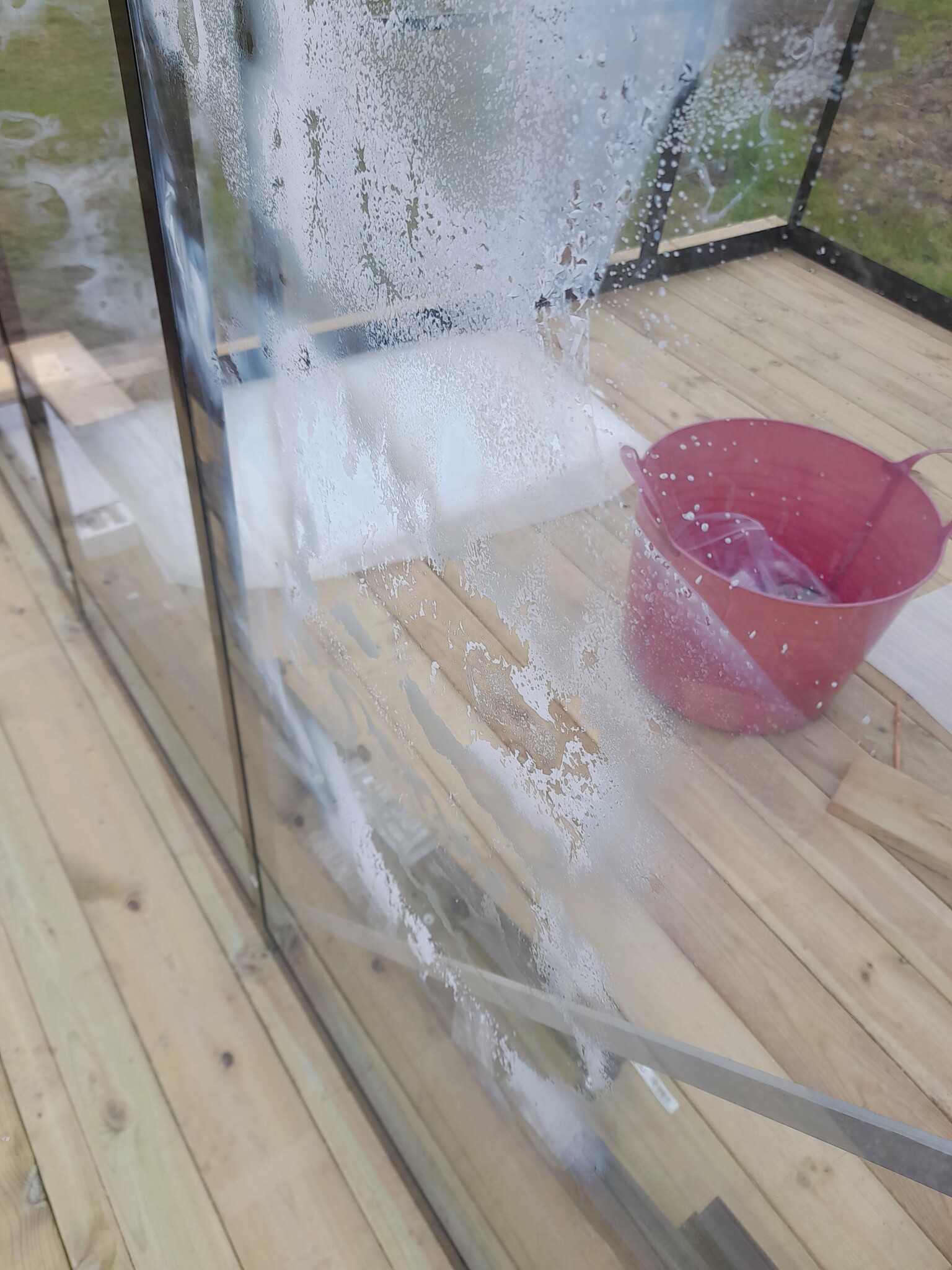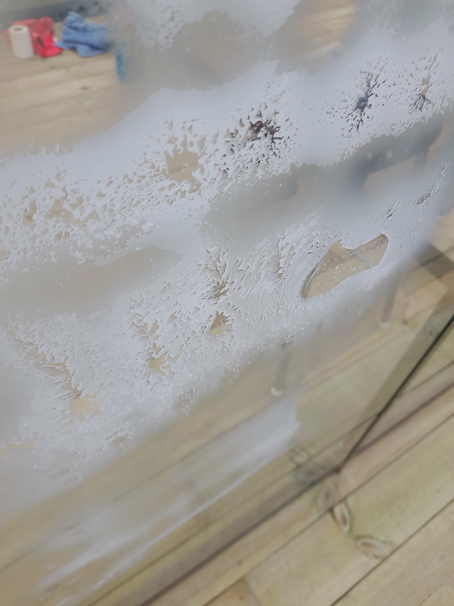 Har nyss satt upp ett växthus. Ur paketet var rutorna belagda med vita fläckar som bitvis har lite kristaller i sig. Dom går att skrapa bort men inte putsa bort. Att skrapa kommer bli synnerligen tidskrävande.