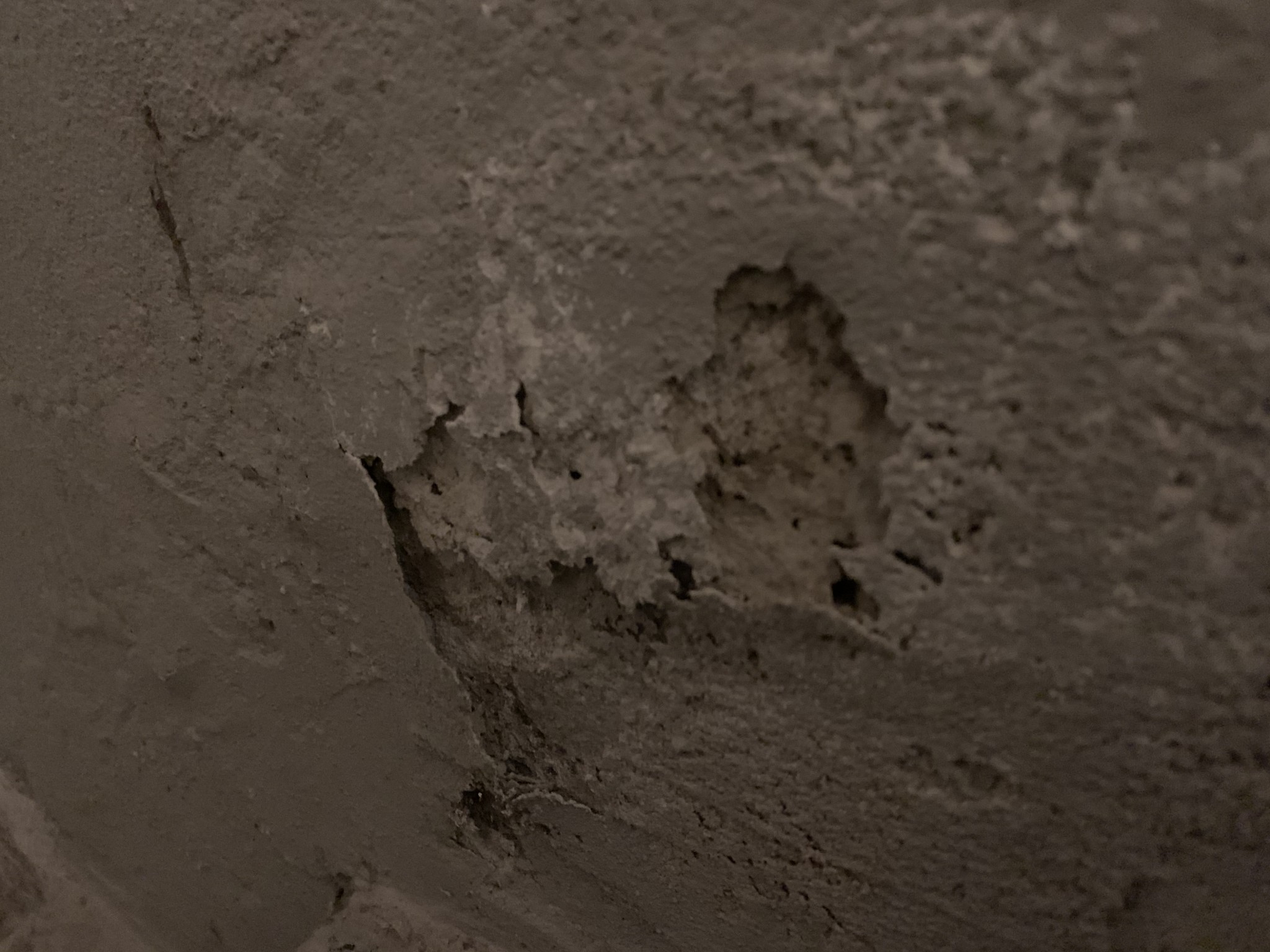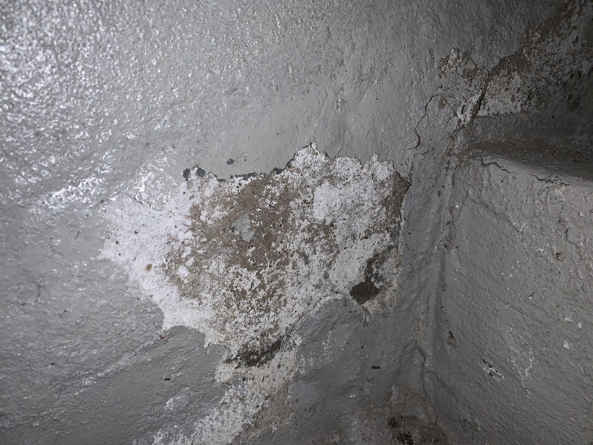 Jag misstänker att det är målat med fel sorts färg och att den färgen stänger in fukten i betongen.. Eller vad beror det på?