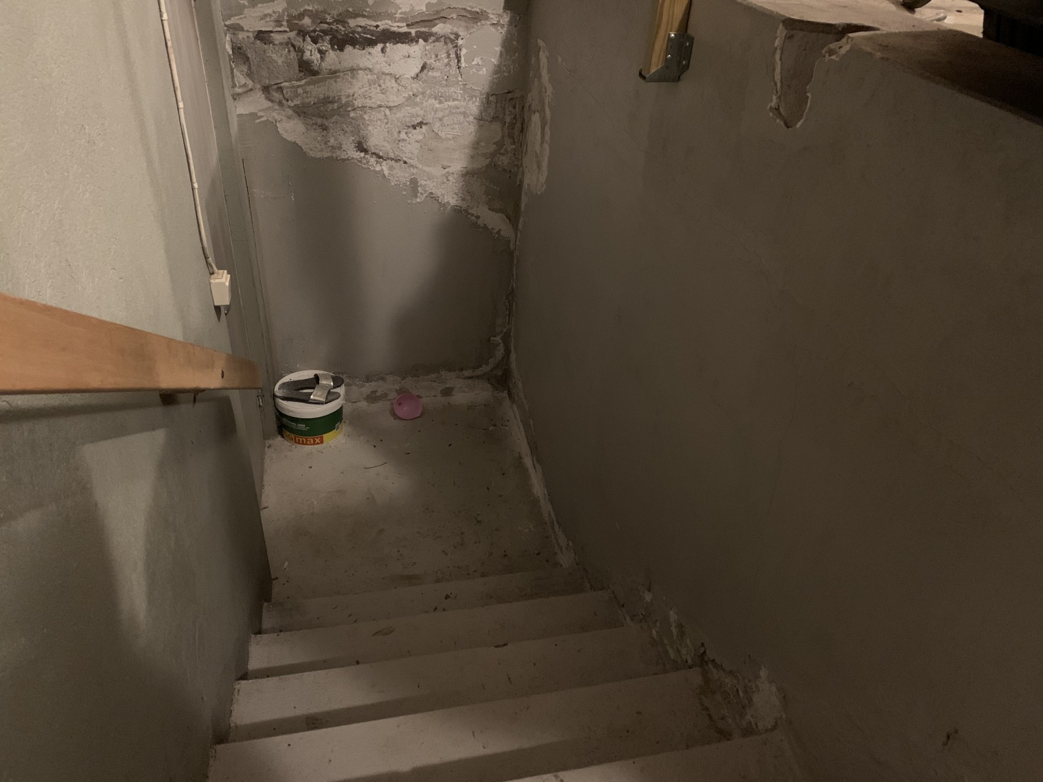 Väggarna i trappen ner till källaren i mitt garage består av målad betong. På många ställen är det stora ”bubblor” under färgen. Sparkar man på dessa bubblor ramlar skalet med färg av och bakom är det ett ”vitt pulver” som man enkelt kan borsta bort för att komma till betongen. Detta vill jag fixa. Men vad bör jag tänka på för att det inte ska hända igen?