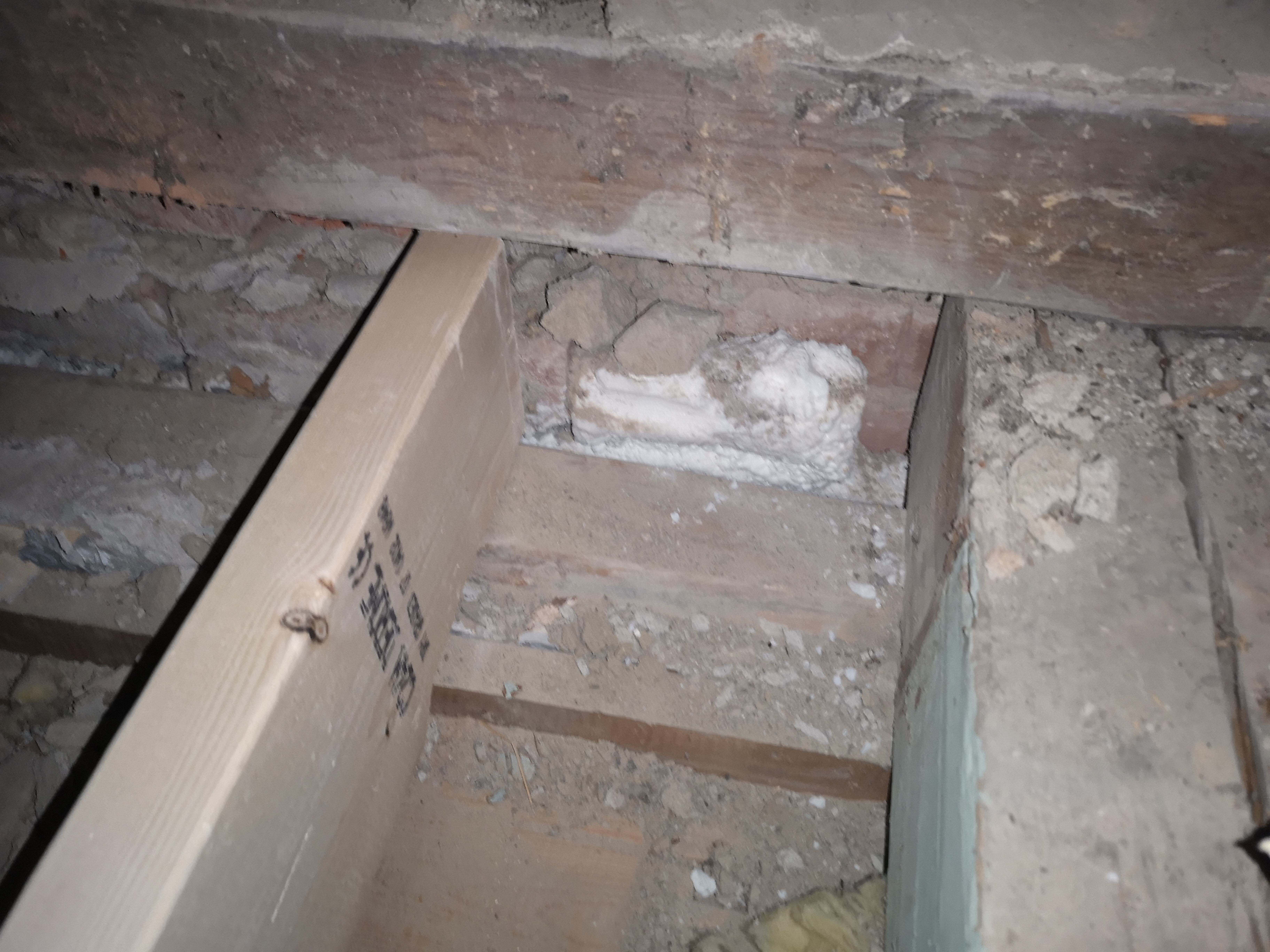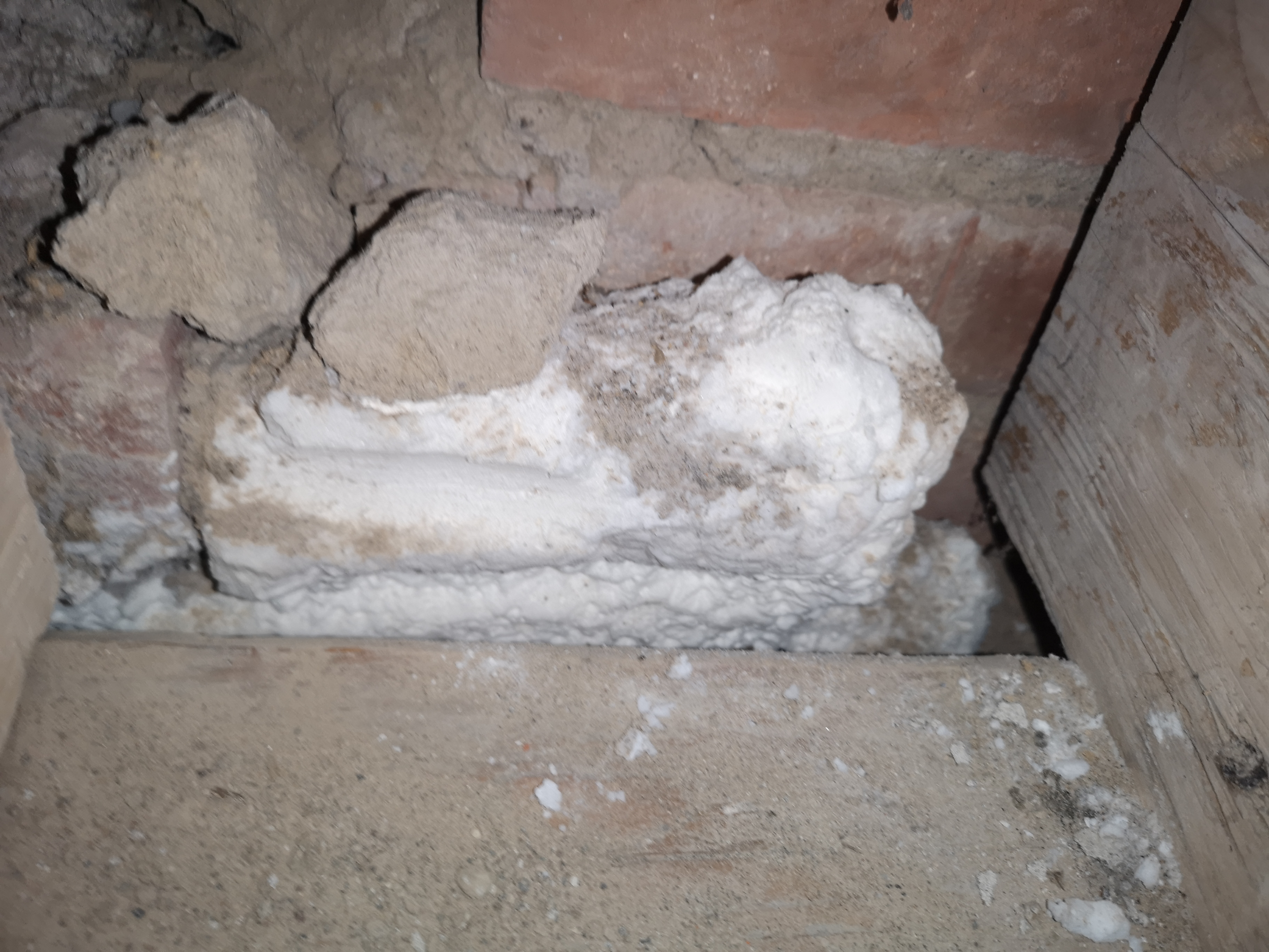 Ajaj, ojoj! Vi river ovanvåningen på vårt hus byggt på 30-talet. Det är ett gammalt badrum som vi rivit ut, det var typ 30 år gammalt. När vi nu rivit ut kattvinden för att förstärka bjälklaget fann jag ett vitt skum i ytterväggen. Vad är detta? Tegel utfällning? Äkta hussvamp? Salt utfällning?