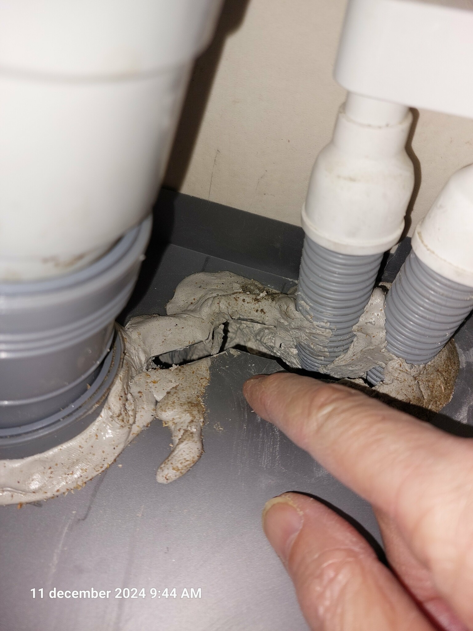 Men ÄR det en spricka? Jag vill minnas att monteringsinstruktionerna för en sådan plastmatta/bricka är gjord så man skall kunna isntallera den efter att rören sitter där. Man skär då upp spår så man kan kränga dit plastmattan och tätar spåren med antingen en form av elastisk tejp, eller täötningsmassa. Jag tycker det ser ut som en sådan uppskärning. Om "tätningen" sedan var utförd som det ser ut på bilden från 11 dec. så verkar det ju inte vara så välgjort.