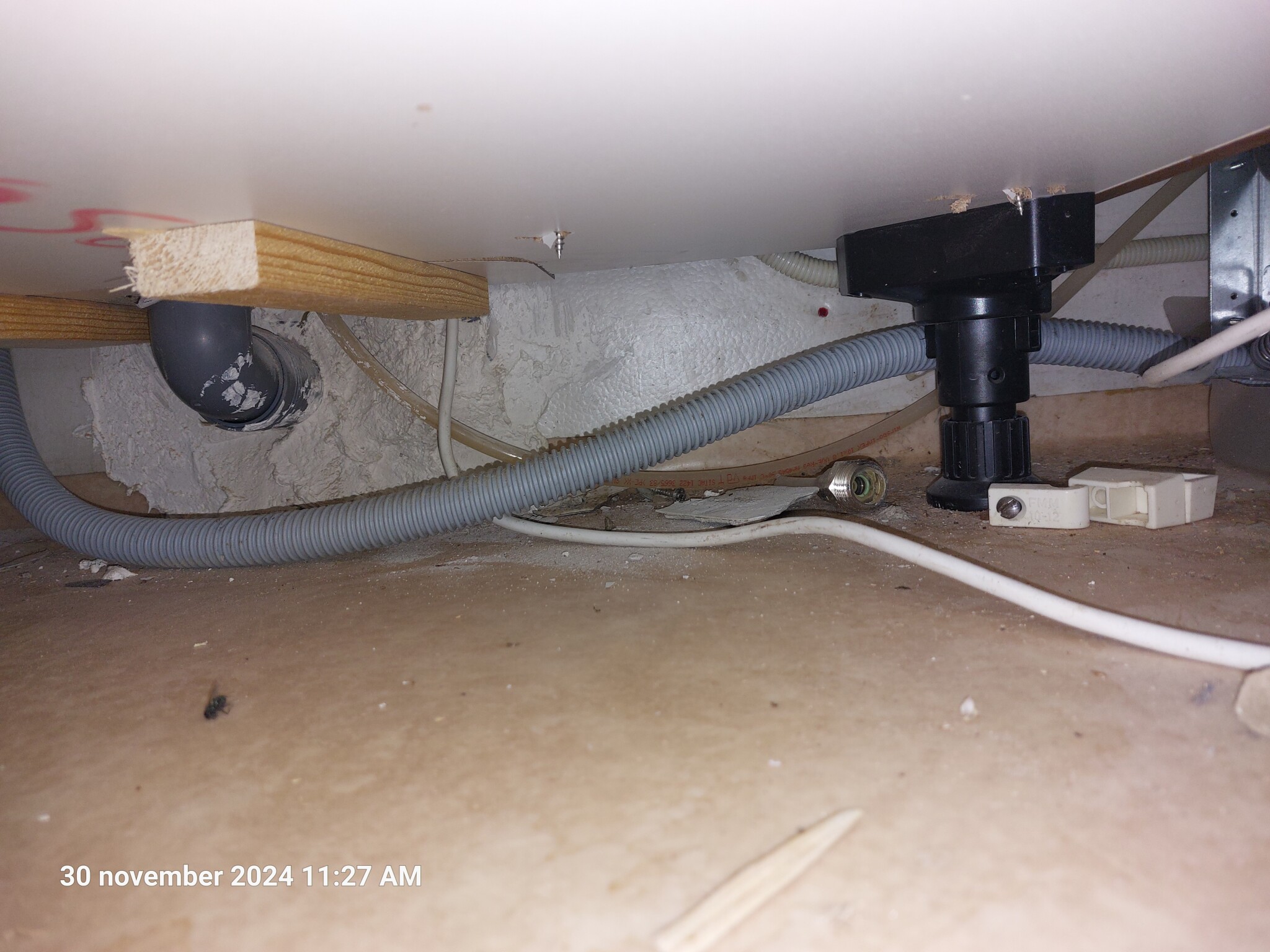 Inte en spricka utan 2 stora hål som går in i varandra. Under bänken ser det inte heller roligt ut. Trästöden är nya och brandskyddet runt avloppet går ner över den uppdrags golvmattanH hempularen skrev:Men ÄR det en spricka? Jag vill minnas att monteringsinstruktionerna för en sådan plastmatta/bricka är gjord så man skall kunna isntallera den efter att rören sitter där. Man skär då upp spår så man kan kränga dit plastmattan och tätar spåren med antingen en form av elastisk tejp, eller täötningsmassa. Jag tycker det ser ut som en sådan uppskärning. Om "tätningen" sedan var utförd som det ser ut på bilden från 11 dec. så verkar det ju inte vara så välgjort.