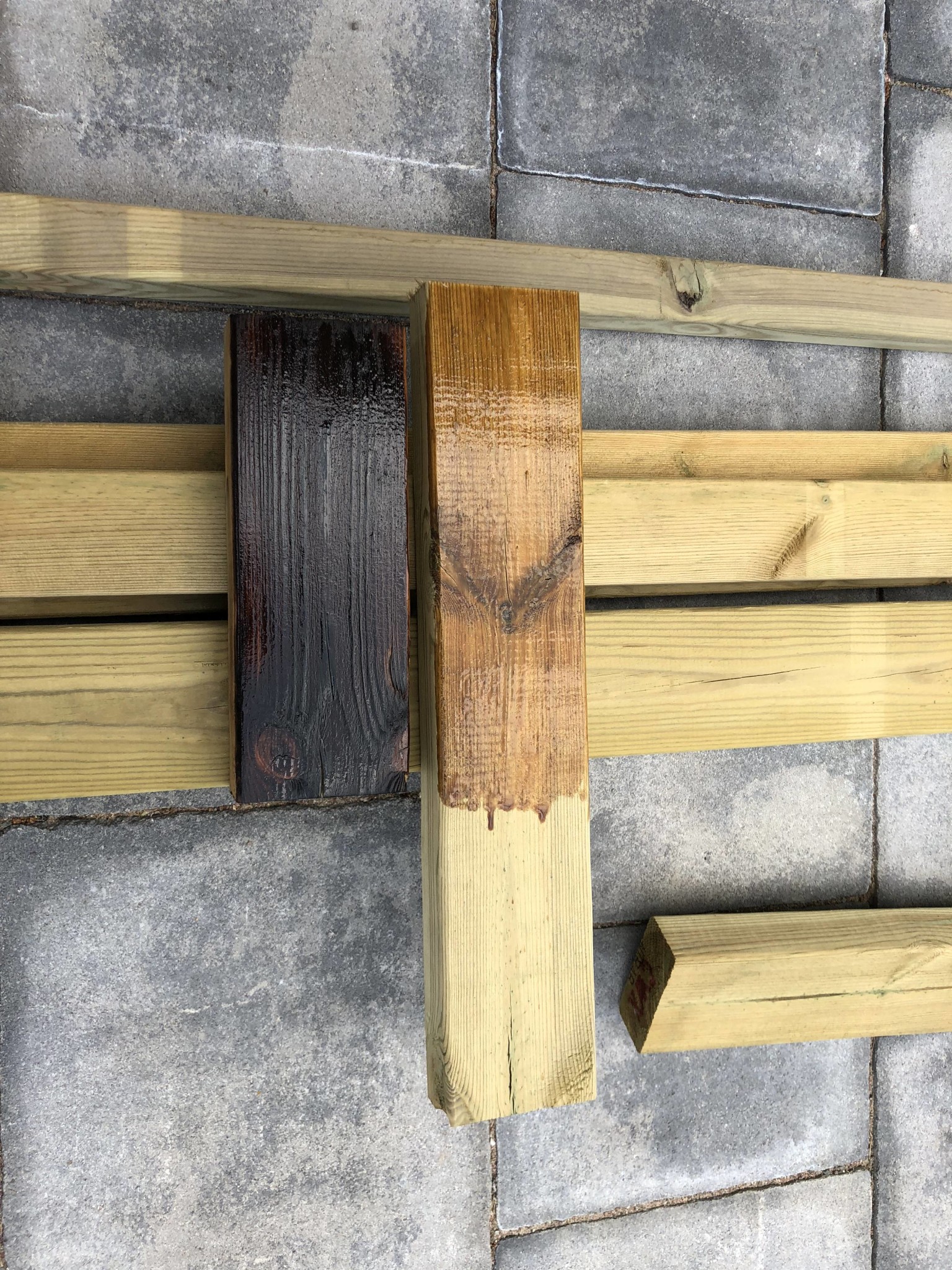 Körde idag ogräsbrännaren på en bit tryckimpat, drog av med en stålborste, blåste av och lade på lite brunpigmenterad olja. Även på vanlig tryckimpat för att jämföra. Blir nog att elda lite på mitt nya altanbygge, blev sjukt bra färg. Gick väldigt fort också.