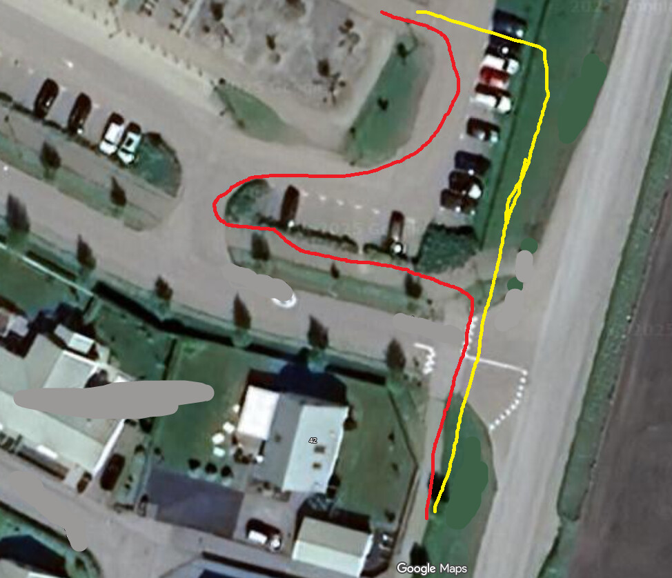 Därefter kör man in via en av in/utfarterna från skolans parkering, längs med parkerade bilar innan man når den relativt fredade biten framför skolbyggnaden.