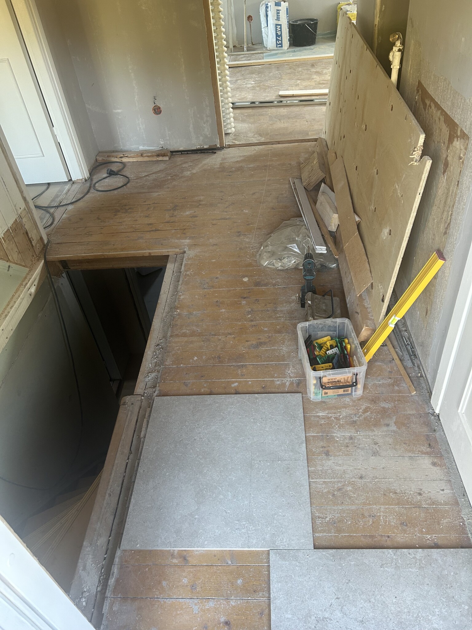 Alt 3. Lägga klinker fram till trappöpnningens slut (ca. mitten av hallen). Det kommer att vara trappräcke runt såklart.