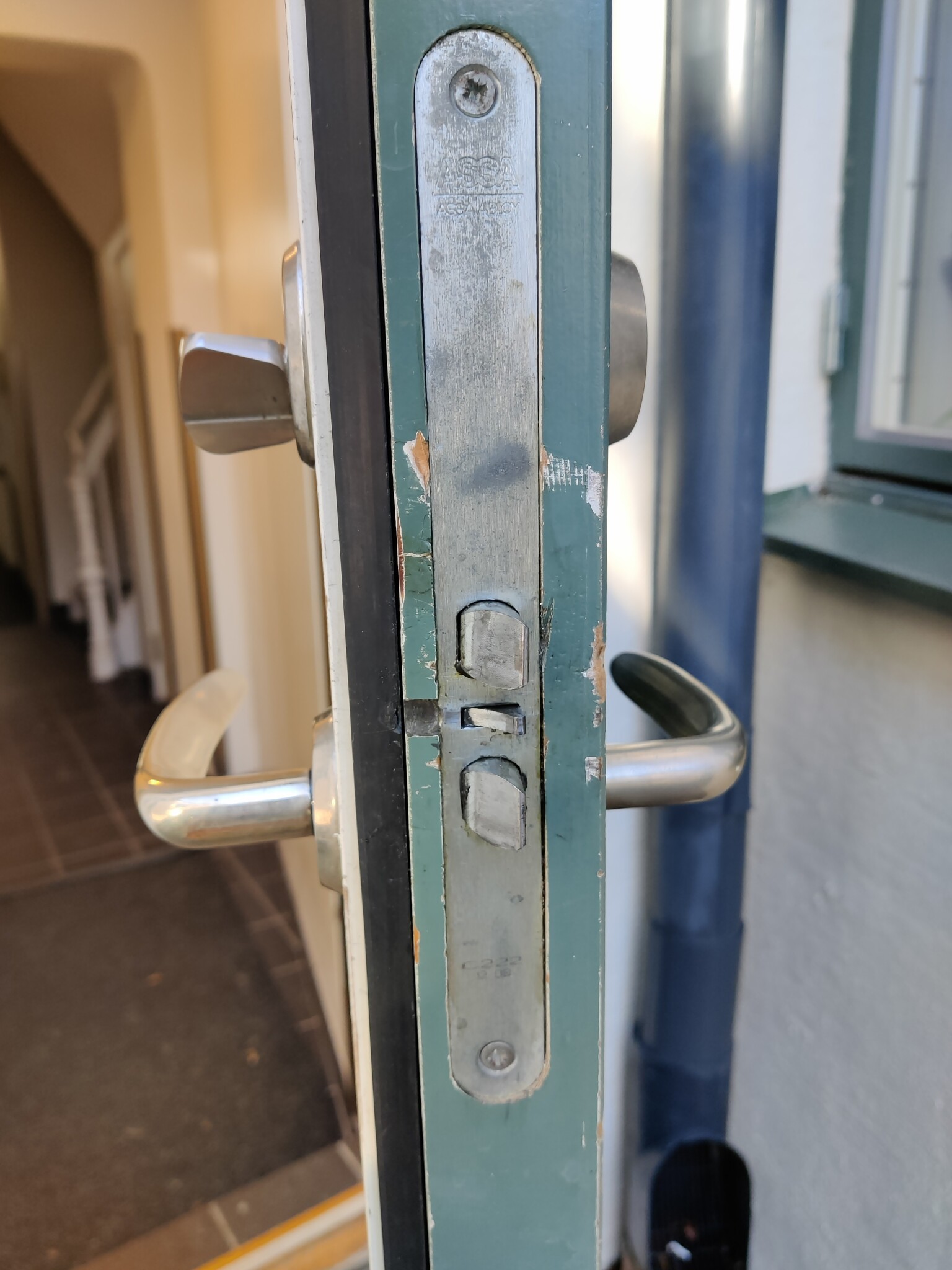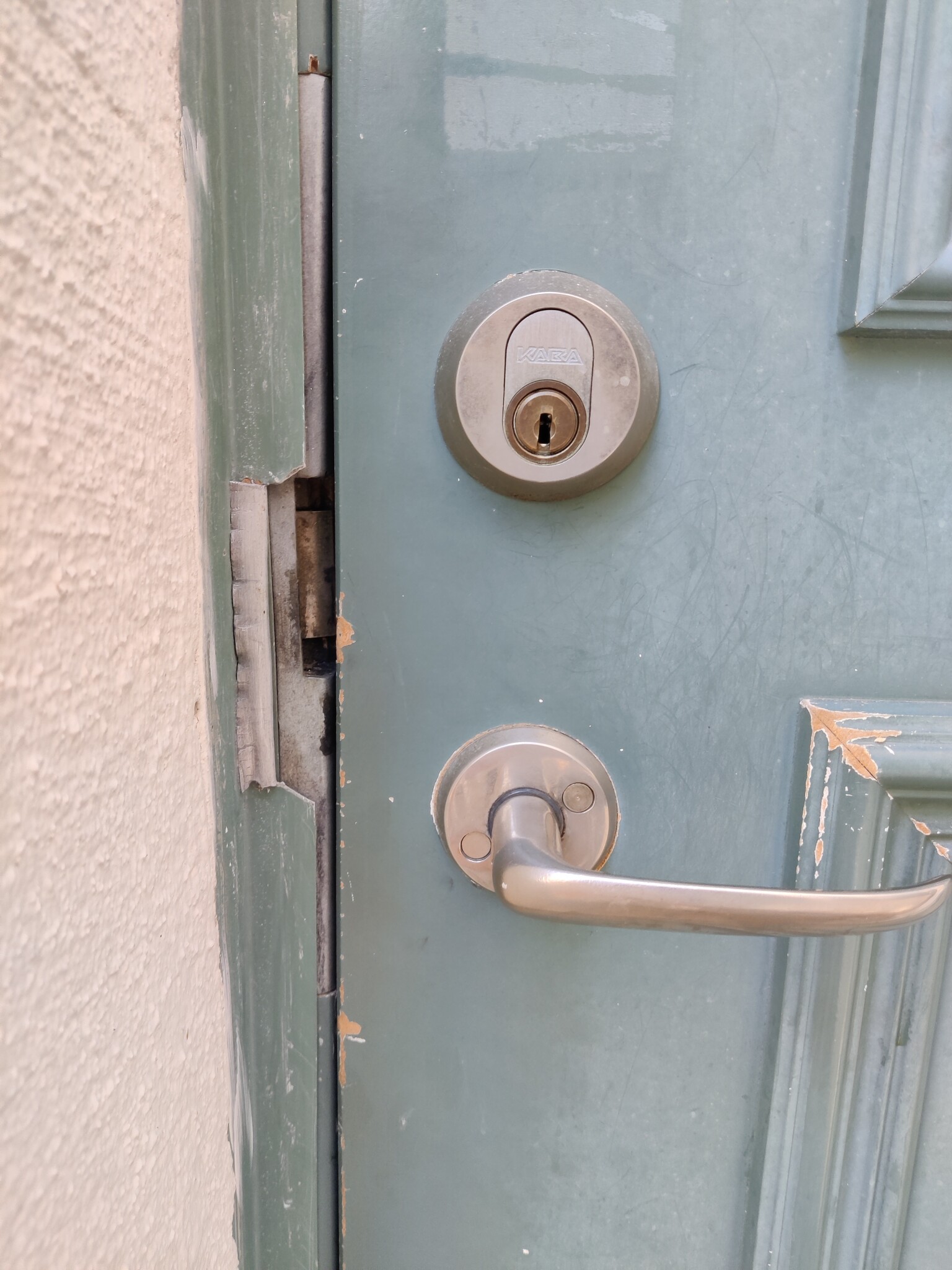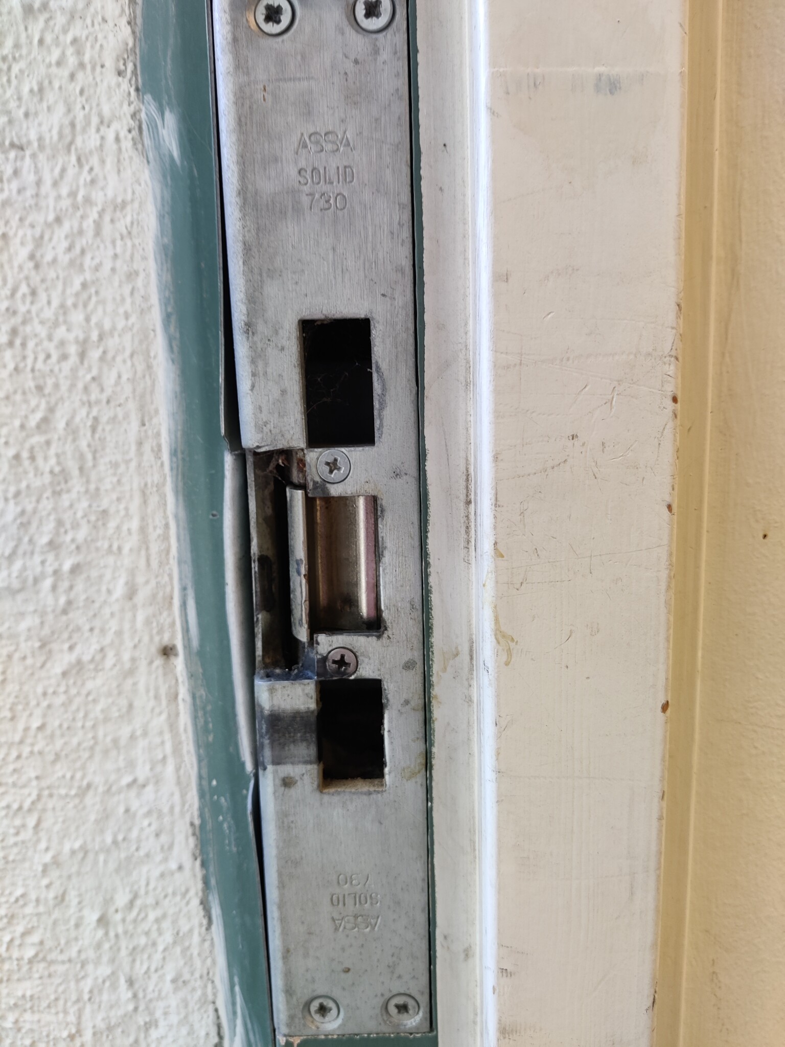Jag bor i ett lägenhetshus där en av våra ytterdörrar inte längre automatiskt låses längre. Jag trodde först att det var för att där satt lite grus och damm ivägen men vid närmre inspektion tror jag att någon har sabbat låset. Det är tydligt att någon har klippt upp metallblecket vid låskolven.