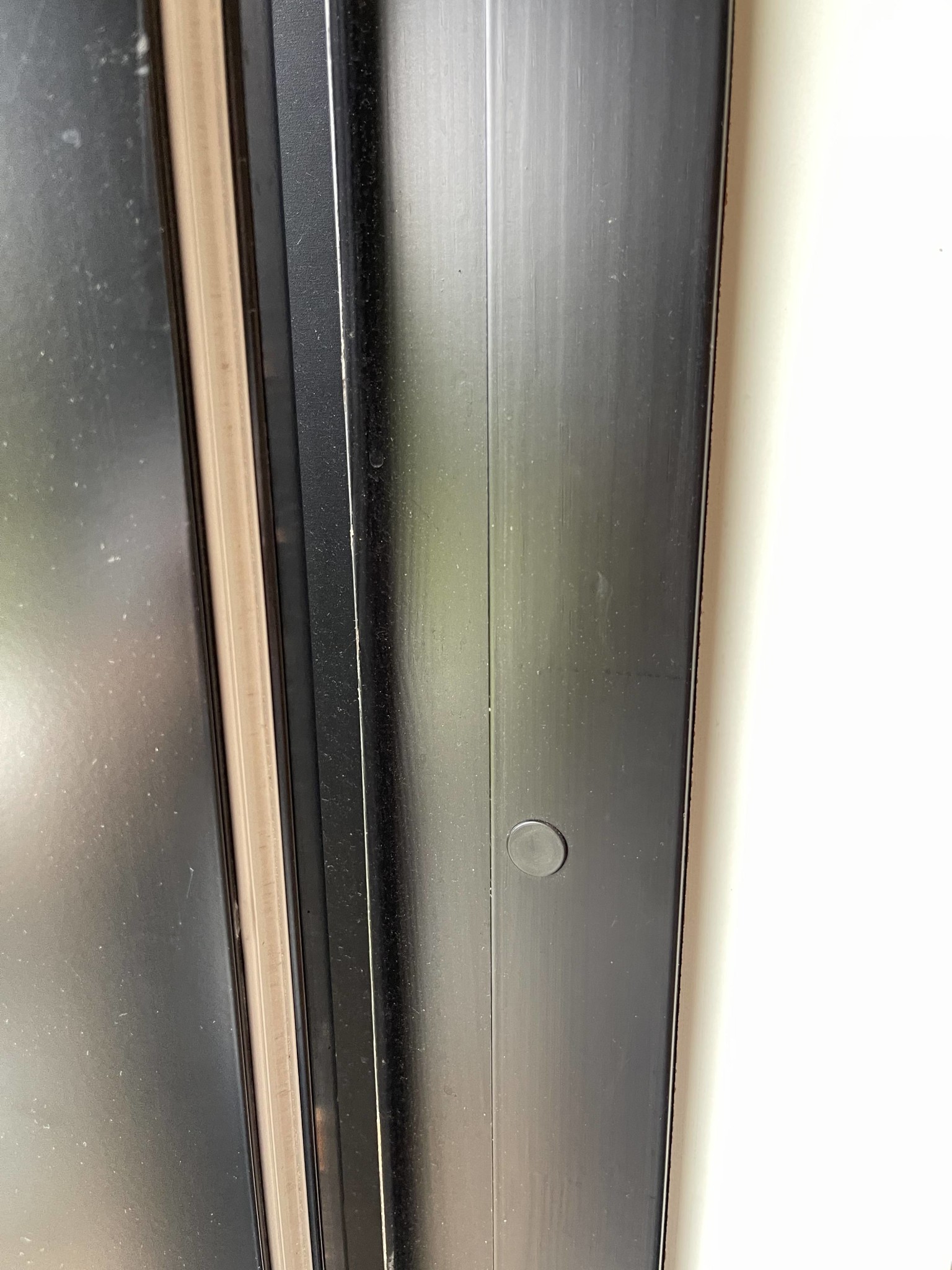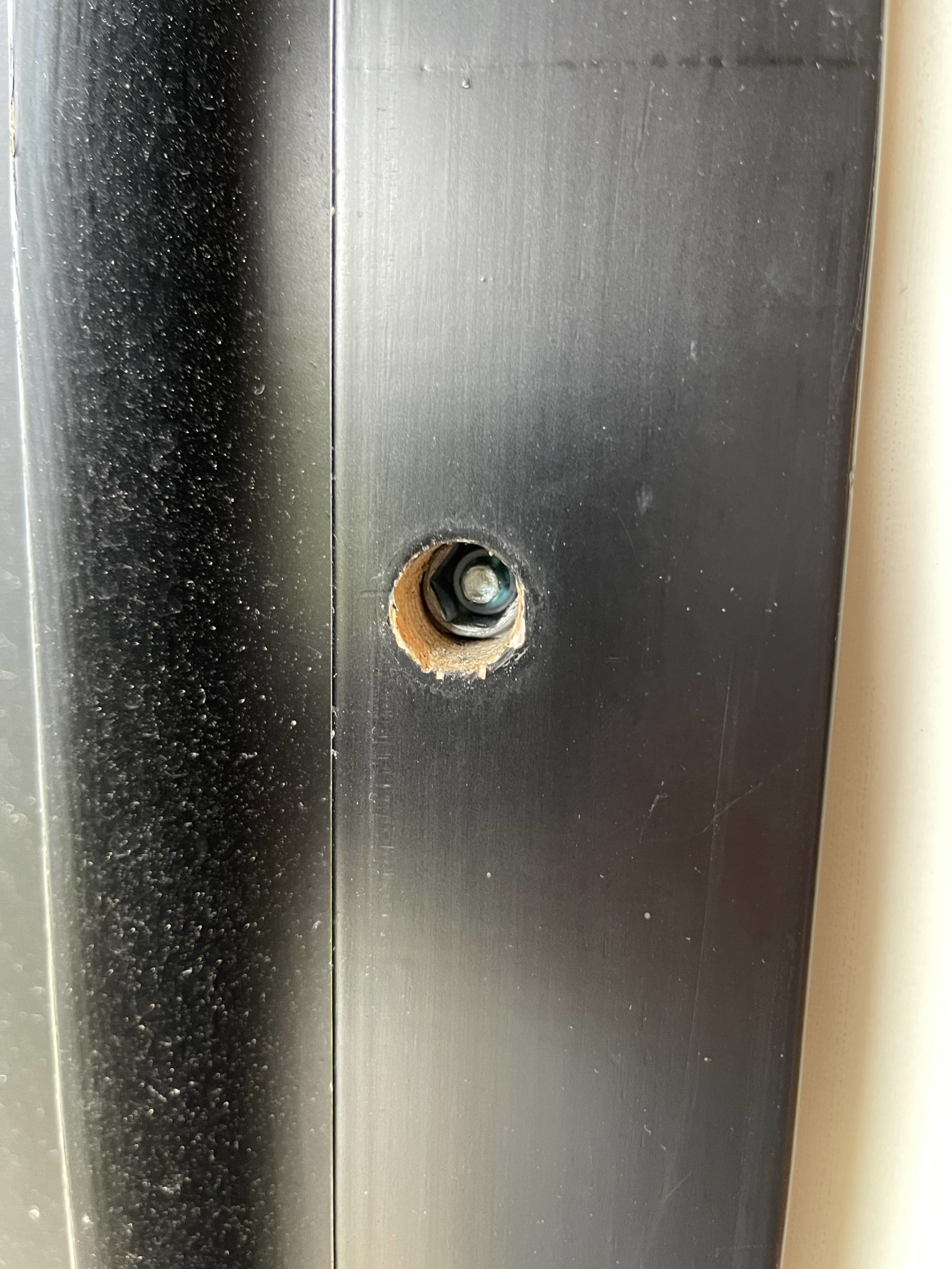 Dom syns tyvär inte på din bild. Med om du kollar på karmen så sitter det små plastpluppar på den. På vissa så ser man dom enbart när dörren e öppen. Pilla bort en sån så ser du karmskruven. Jo det är som en storinsexnyckel kan man säga.