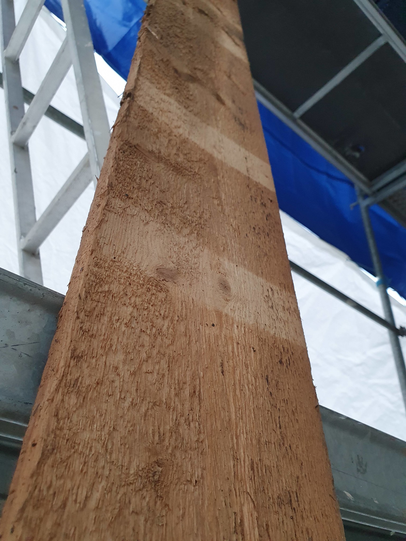 Jag valde att byta ut halva gaveln ungefär med nyinförskaffade furubrädor. En stor andel kärna på de flesta av brädorna men ganska mycket kvist så troligen inte från rotstock utan mellanstock.
