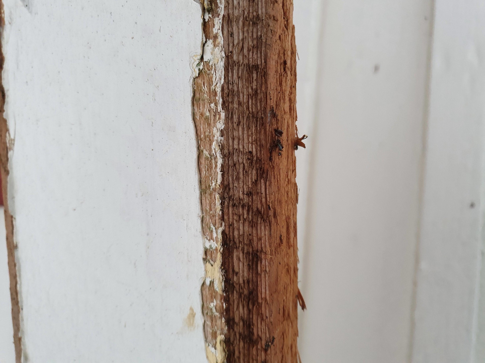 När jag nu tar ner de skadade panelbrädorna är det ganska många som har vankant med barken kvar, alltså en bräda med övervägande del splint, om ens någon kärnved alls. Bara delar av brädan är skadad, men då kraftigt skadad, rötan har bara lämnat ett tunt fanér kvar på ytan av brädan, utanför skadan kan brädorna i princip se ut som nya på baksidan. Enligt gällande riktlinjer och tips bör man absolut inte sätta upp en furubräda som ytterpanel och absolut inte en som mest innehåller splintved (dock förstår jag det som att linoljefärg fäster bra på furu, framförallt på en splintyta eftersom den inte är lika fet som kärnveden) men jag står som sagt med "bevisen i hand" att en furubräda med övervägande del splintved mycket väl kan användas som ytterpanel, så länge den inte utsätts för extrem mängd fukt.