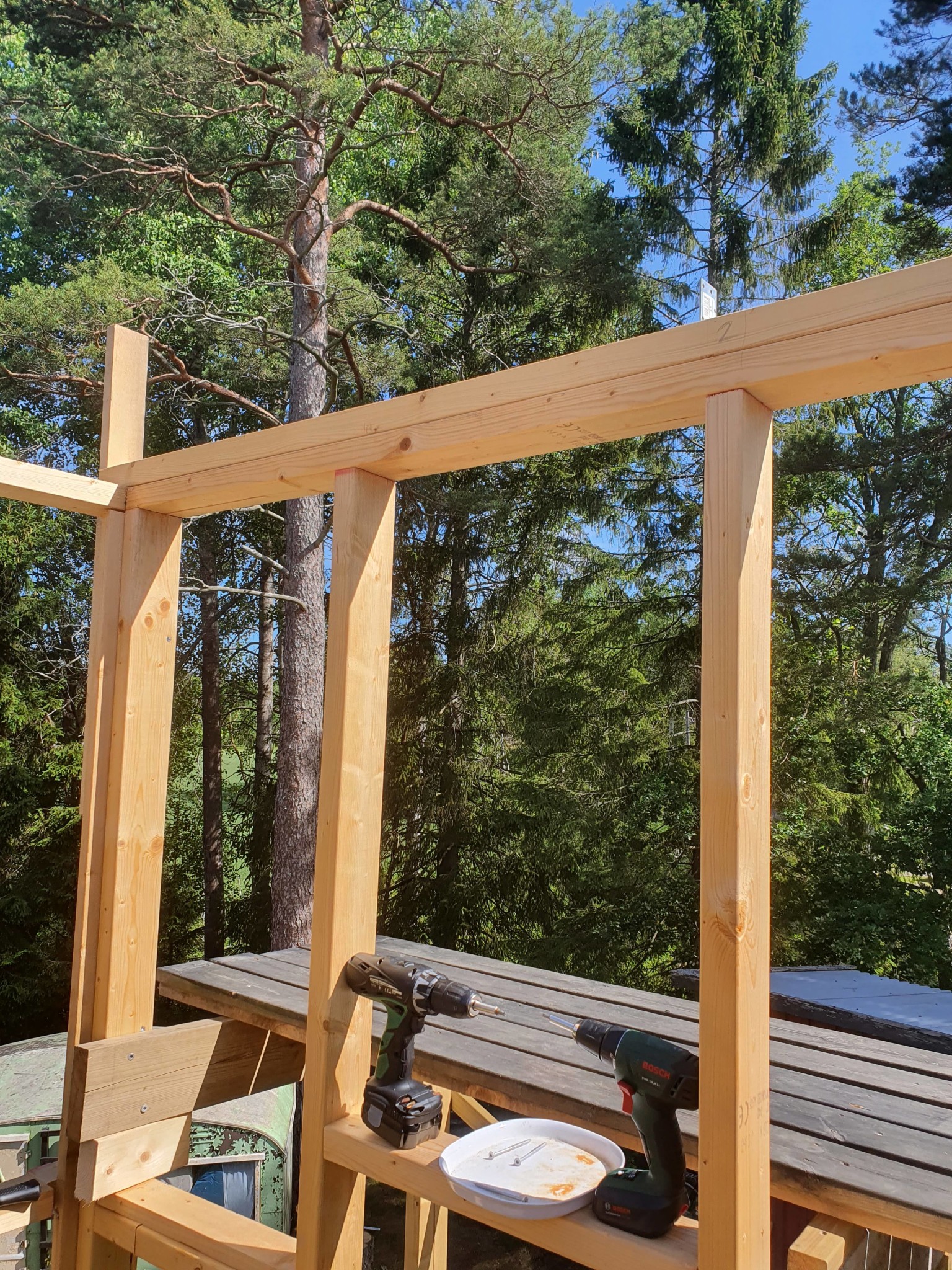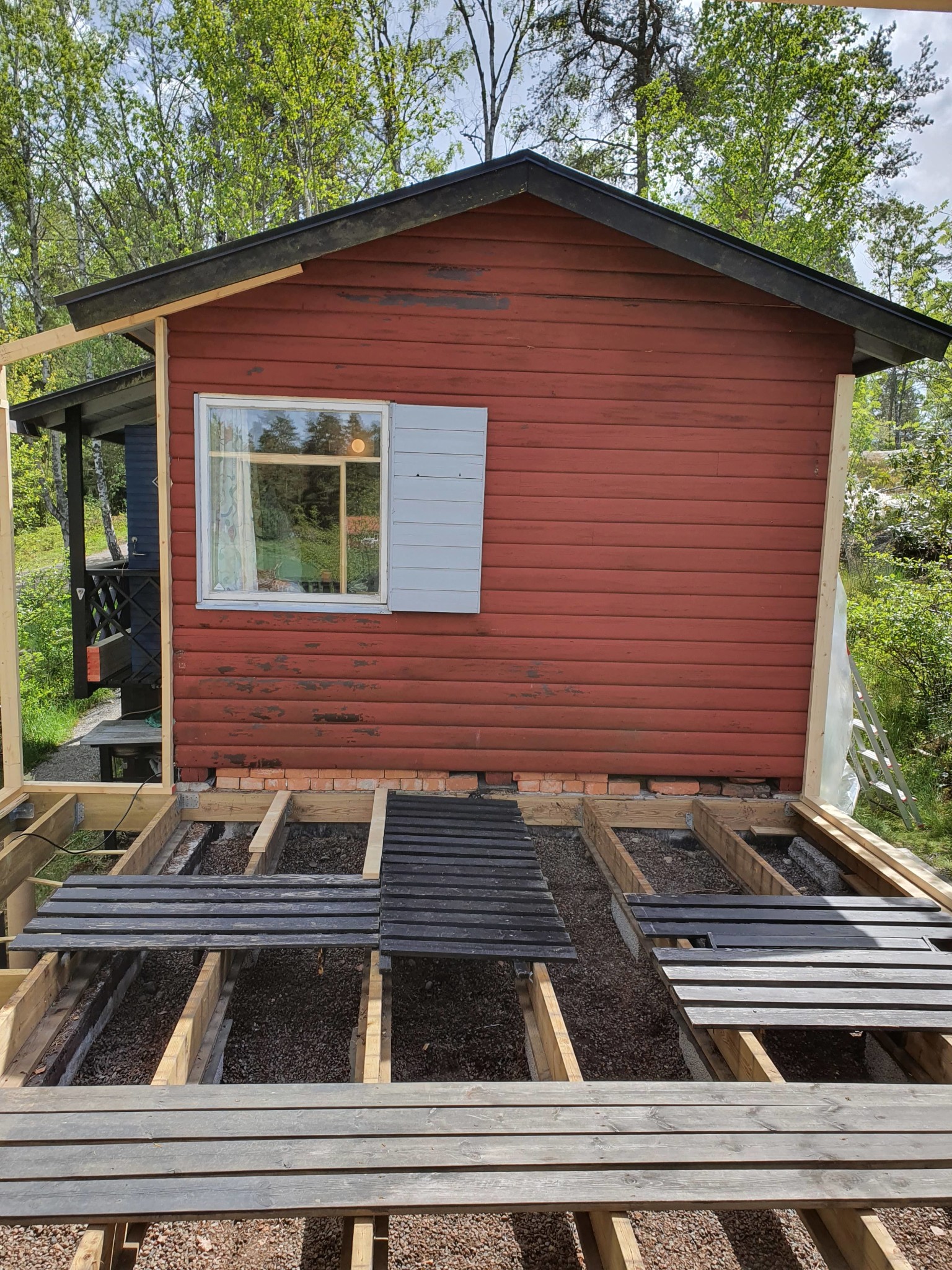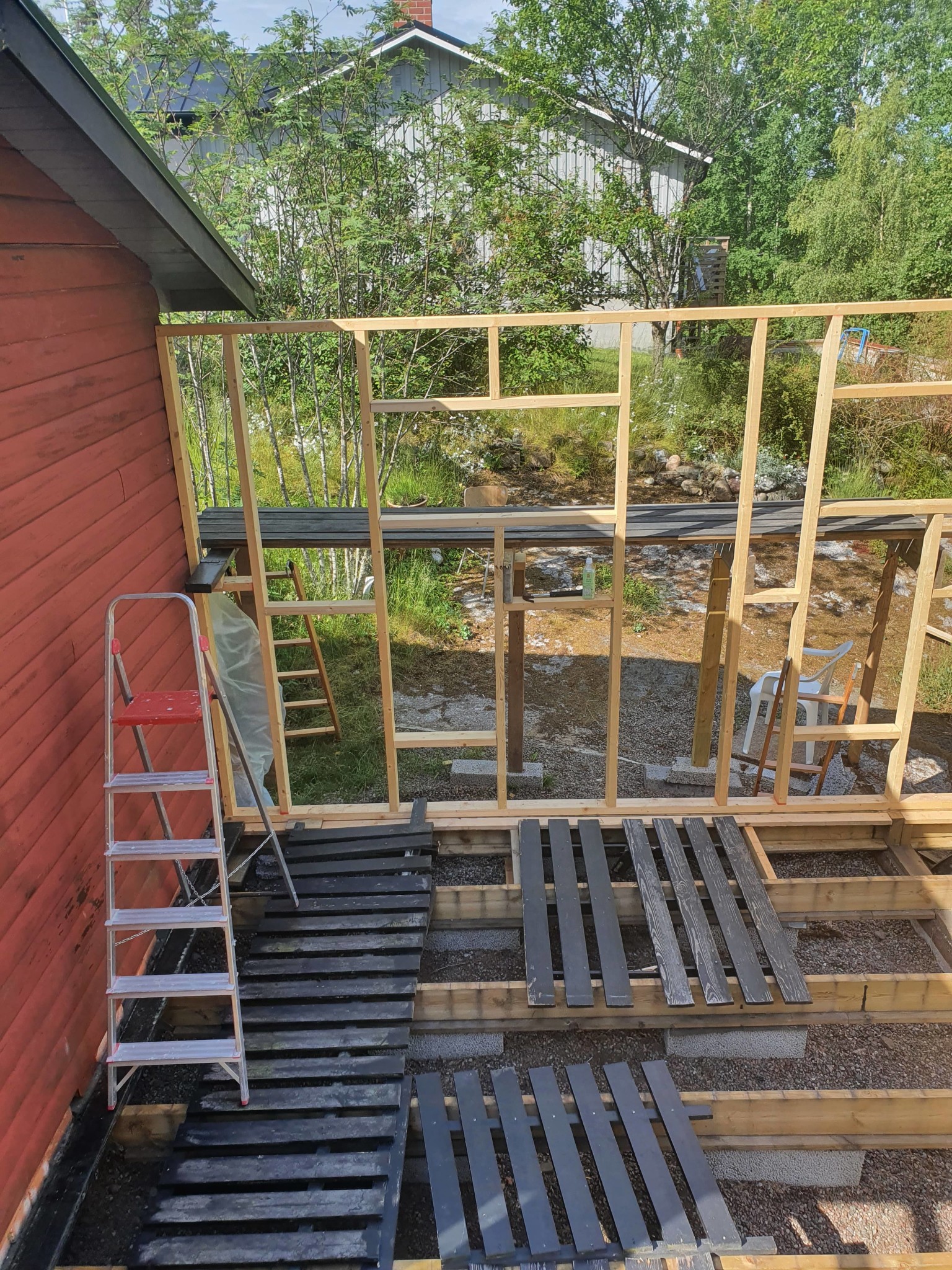 Jag har gjort väggarna av 45x95 reglar, som i befintliga stugan. Sedan blir det spånskivor o gipsskivor på insidan, locklistpanel på utsidan. En del fönster o altandörr.