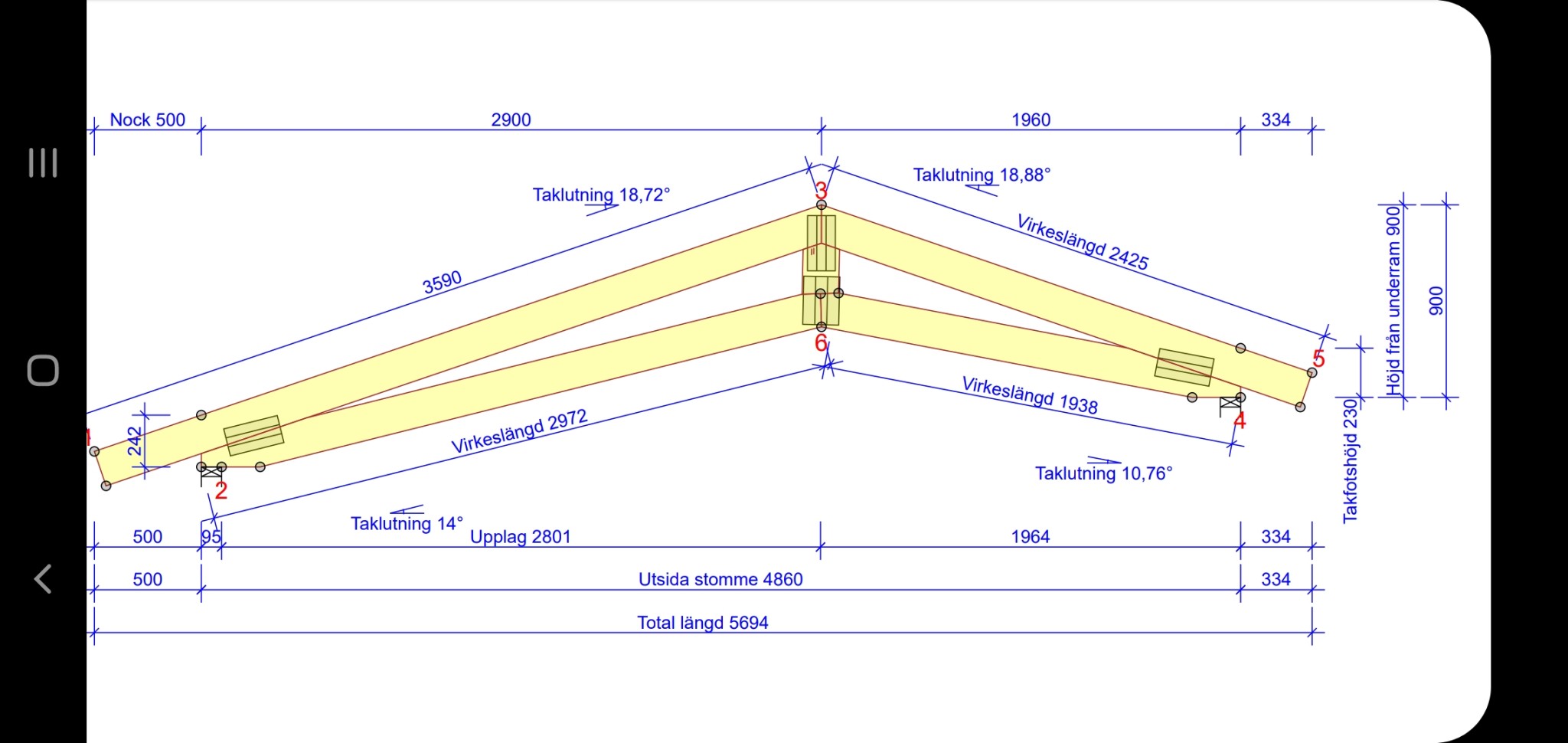 Nu har jag beställt takstolar och fått dem. De är mycket rejälare än befintliga takstolar. De är fem saxtakstolar av 45x170 virke och väger ca 40kg styck. På detta blir det råspont, papp och plåttak.